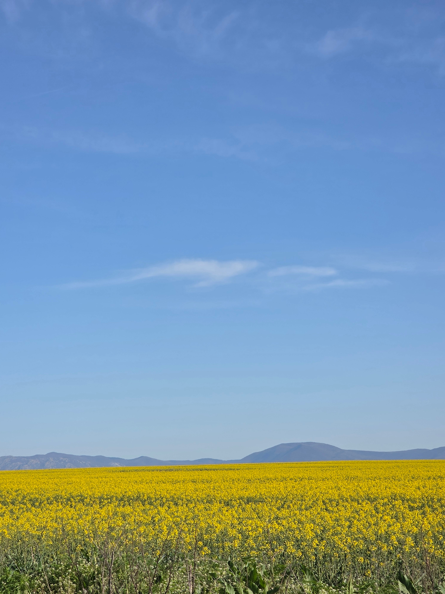 The image captures a vibrant and expansive natural landscape, likely located in Drazhevo, Bulgaria. A vast field of bright yellow flowers, characteristic of rapeseed or canola, dominates the lower two…read more