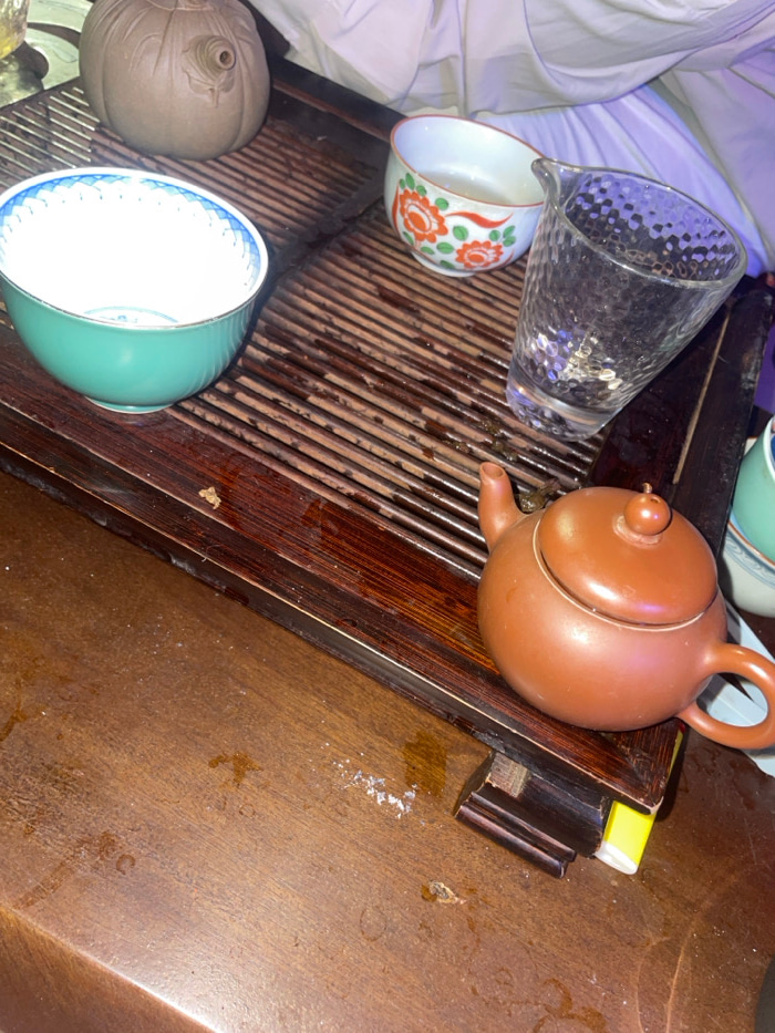 The image displays a close-up, elevated view of a tea ceremony setup, presumably in Nha Trang, Vietnam. No individuals are present. The primary subjects are various ceramic and glass vessels arranged…read more