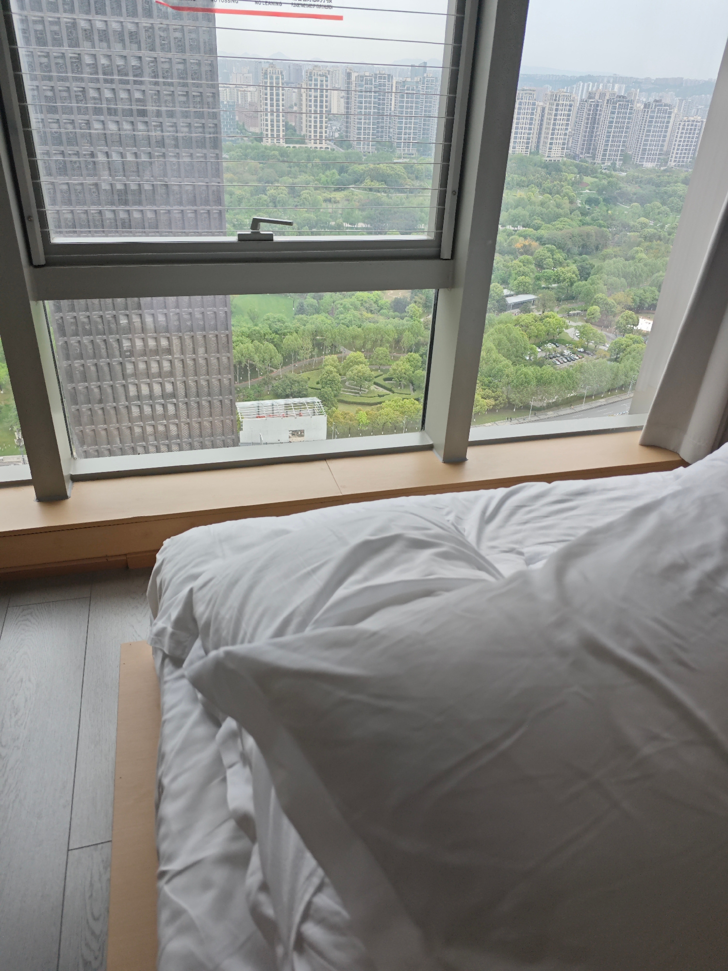 The image depicts a view from a high-rise window in what appears to be a hotel room. In the foreground, a bed with white linens and a large pillow takes up much of the scene. The window provides a vie…read more