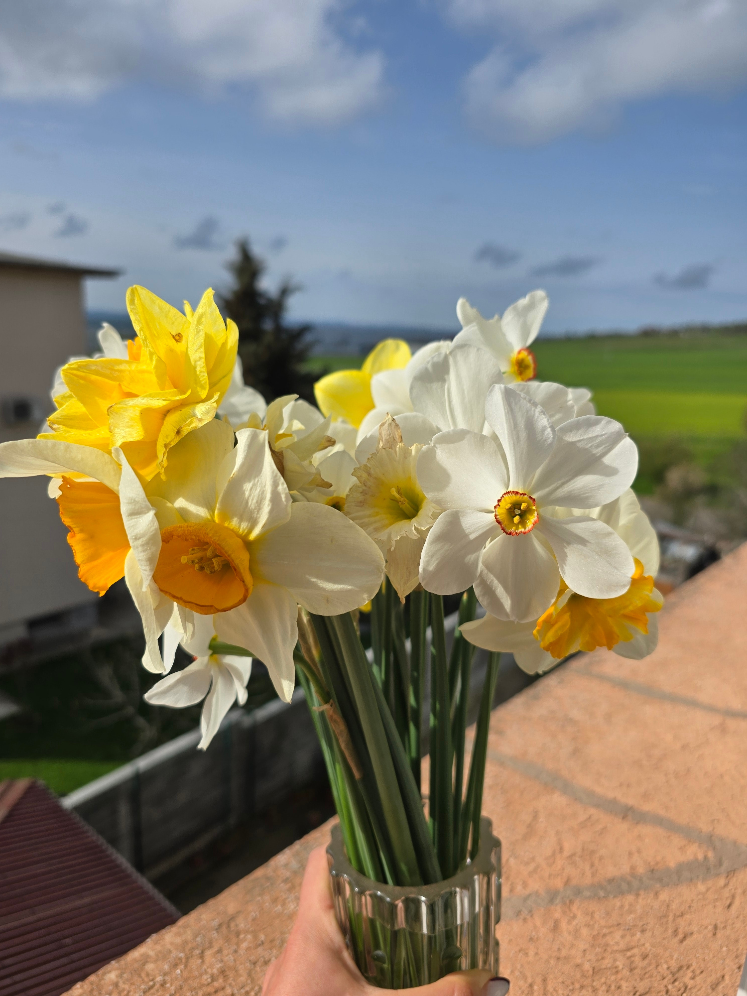 A bouquet of daffodils in shades of white and yellow is held against a background of a cloudy blue sky, a green field, and the edge of a brick-colored structure. The flowers are densely packed togethe…read more