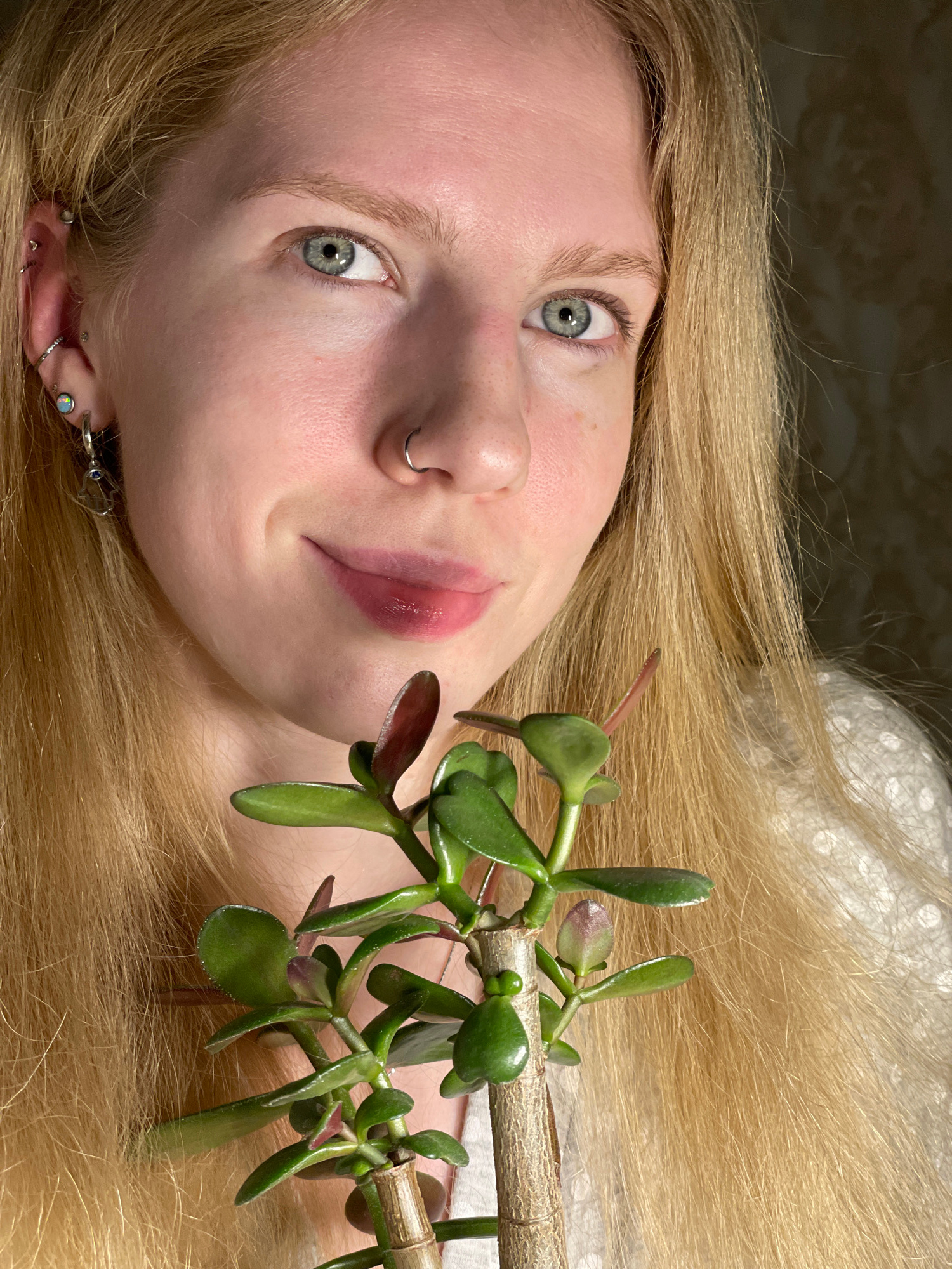 A fair-skinned person with blonde hair is lying down, facing the camera. The person has light blue eyes, a nose ring, and multiple earrings in their left ear. A jade plant lies on top of the person'sā¦read more