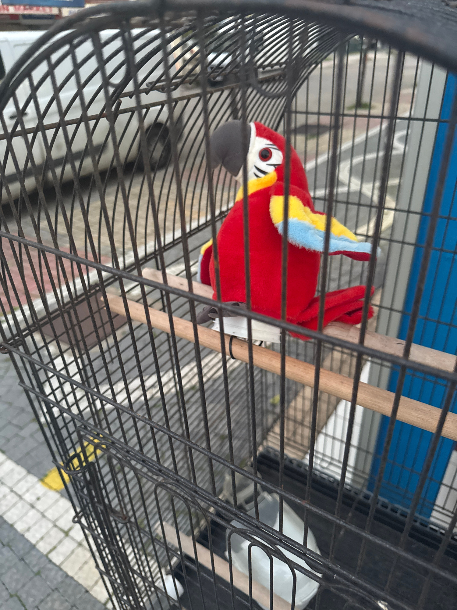 A stuffed red parrot sits on a wooden perch inside a black wire cage. The cage is situated in an outdoor location that appears to be in Alanya, Turkey, based on surrounding visual cues. The parrot toyβ¦read more