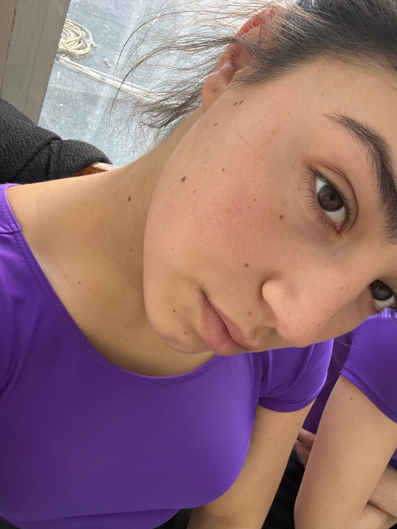 The image is a close-up portrait of a young woman, likely a selfie, taken indoors in Sofia, Bulgaria. The subject has fair skin, dark brown eyes, and prominent dark eyebrows. Her dark hair is pulled b…read more