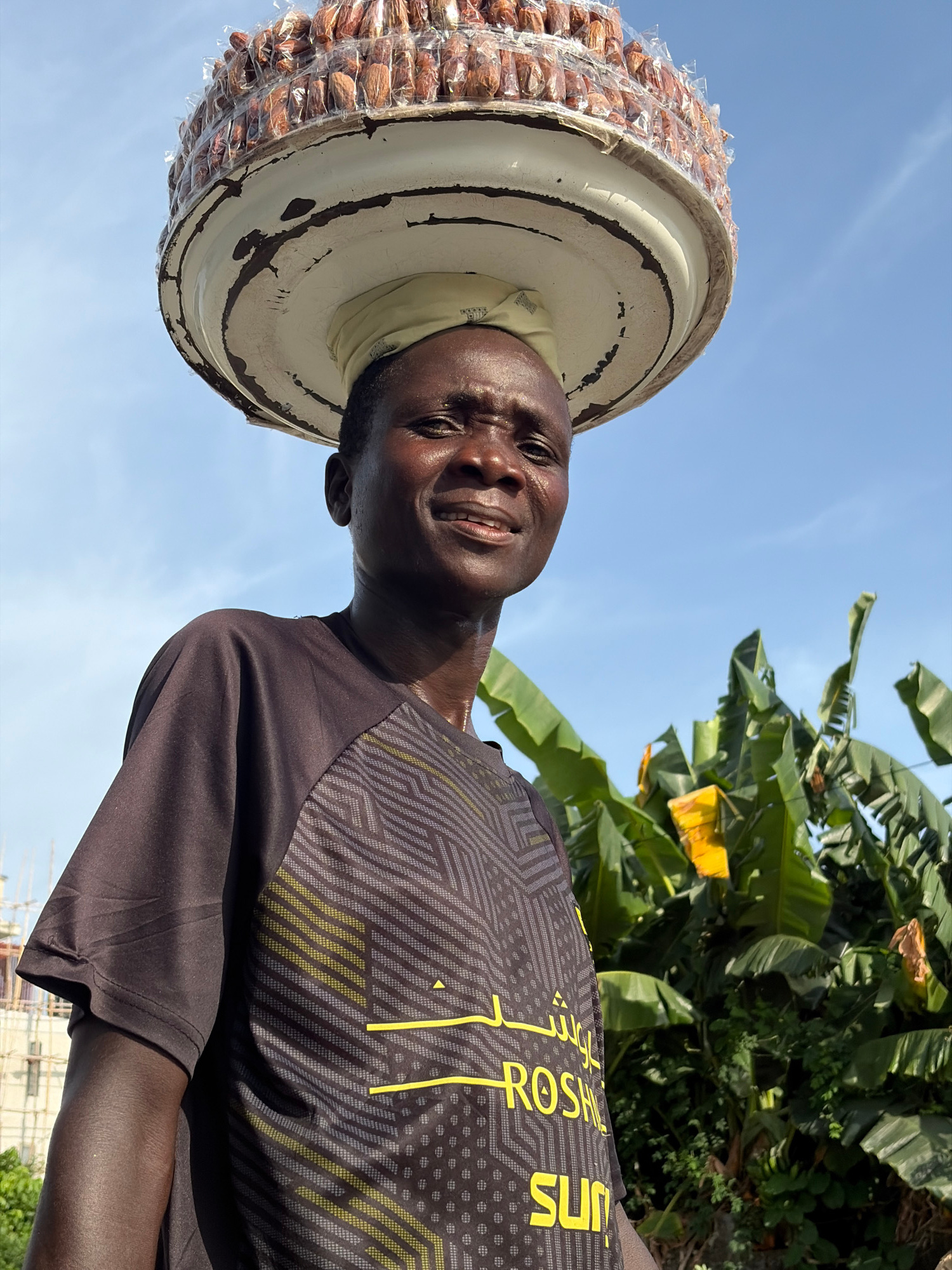 A low-angle shot shows an Igbo man in Igboefon, Nigeria, balancing a large, white, cylindrical container filled with small packets of dates on his head. He is wearing a black t-shirt with a geometric…read more