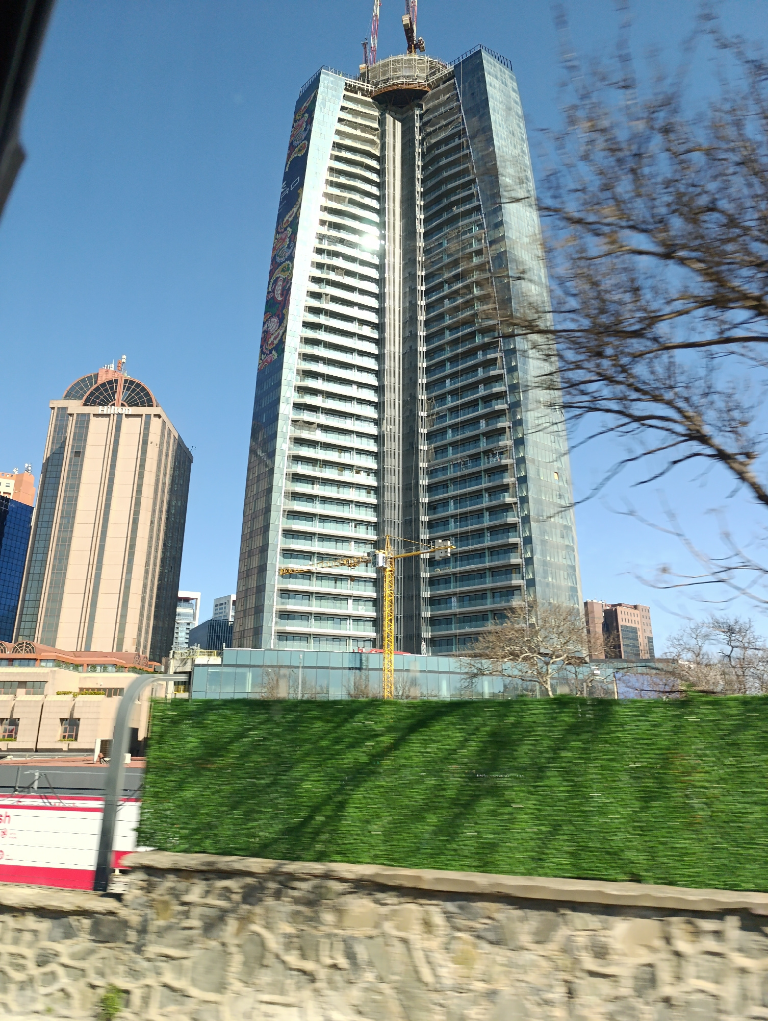 The photograph captures a scene in Sarıyer, Turkey, featuring modern architecture under a clear, blue sky. Dominating the frame is a tall skyscraper with a unique design, appearing to be a mix of glas…read more