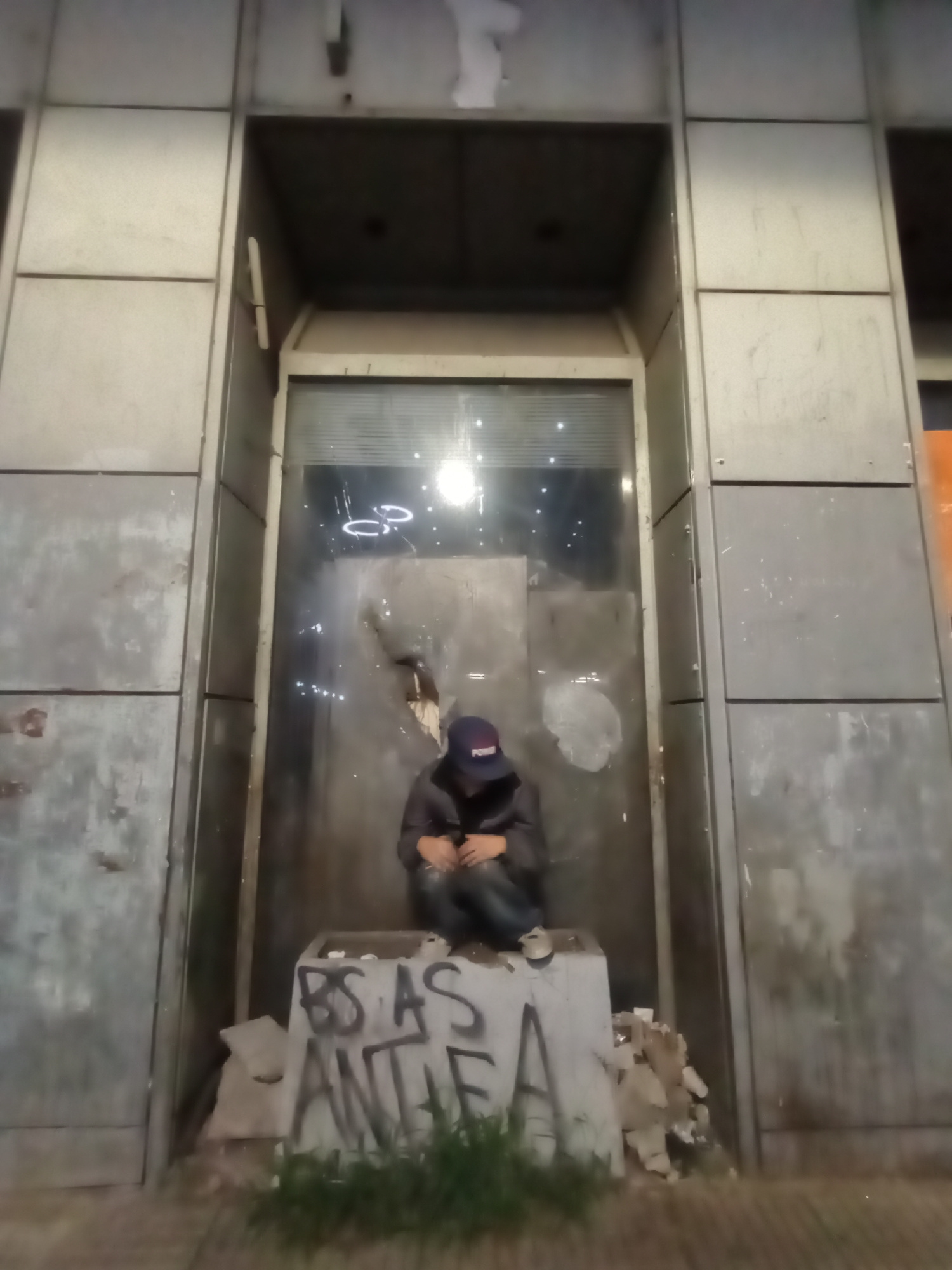 The image shows an exterior urban setting in Buenos Aires, Argentina. A person wearing dark clothing and a cap is crouched in a recessed area or alcove beside a building, appearing to be sleeping or r…read more