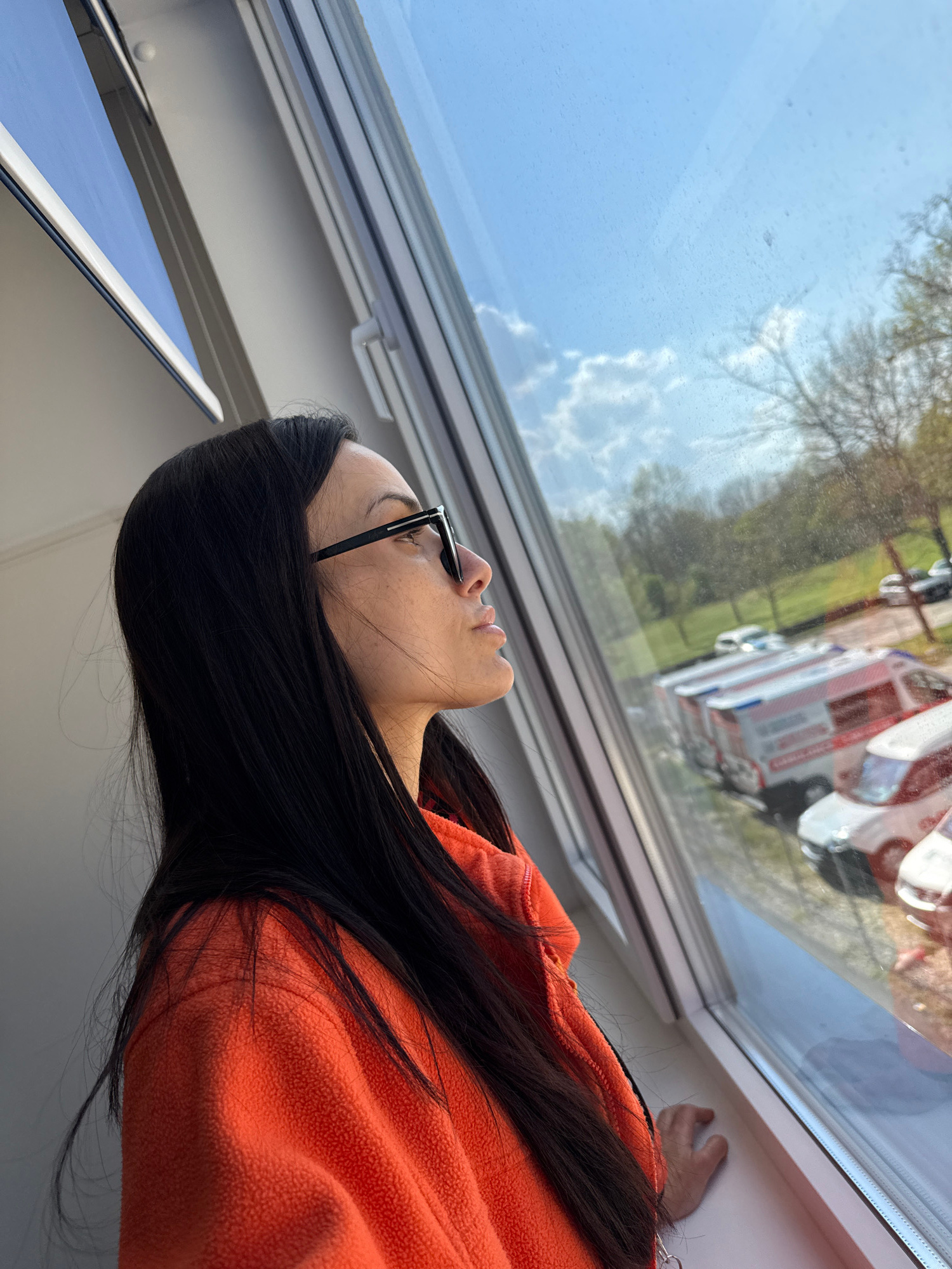 A woman with long, dark hair and glasses, wearing an orange hooded sweatshirt, is looking up toward a window. The window reflects an upside-down view of a street scene that contains buildings, trees,…read more
