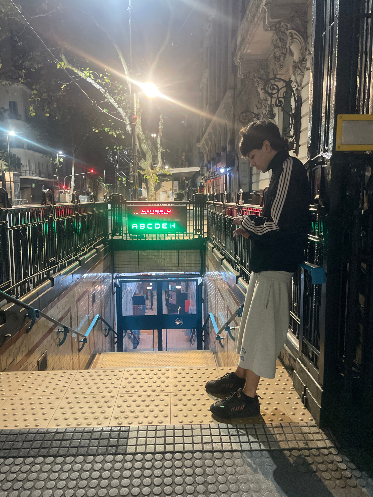 The image captures a nighttime urban scene, focusing on a young person standing near the entrance of a subway (Subte) station. The person, appearing to be male, is dressed in a dark track jacket withβ¦read more