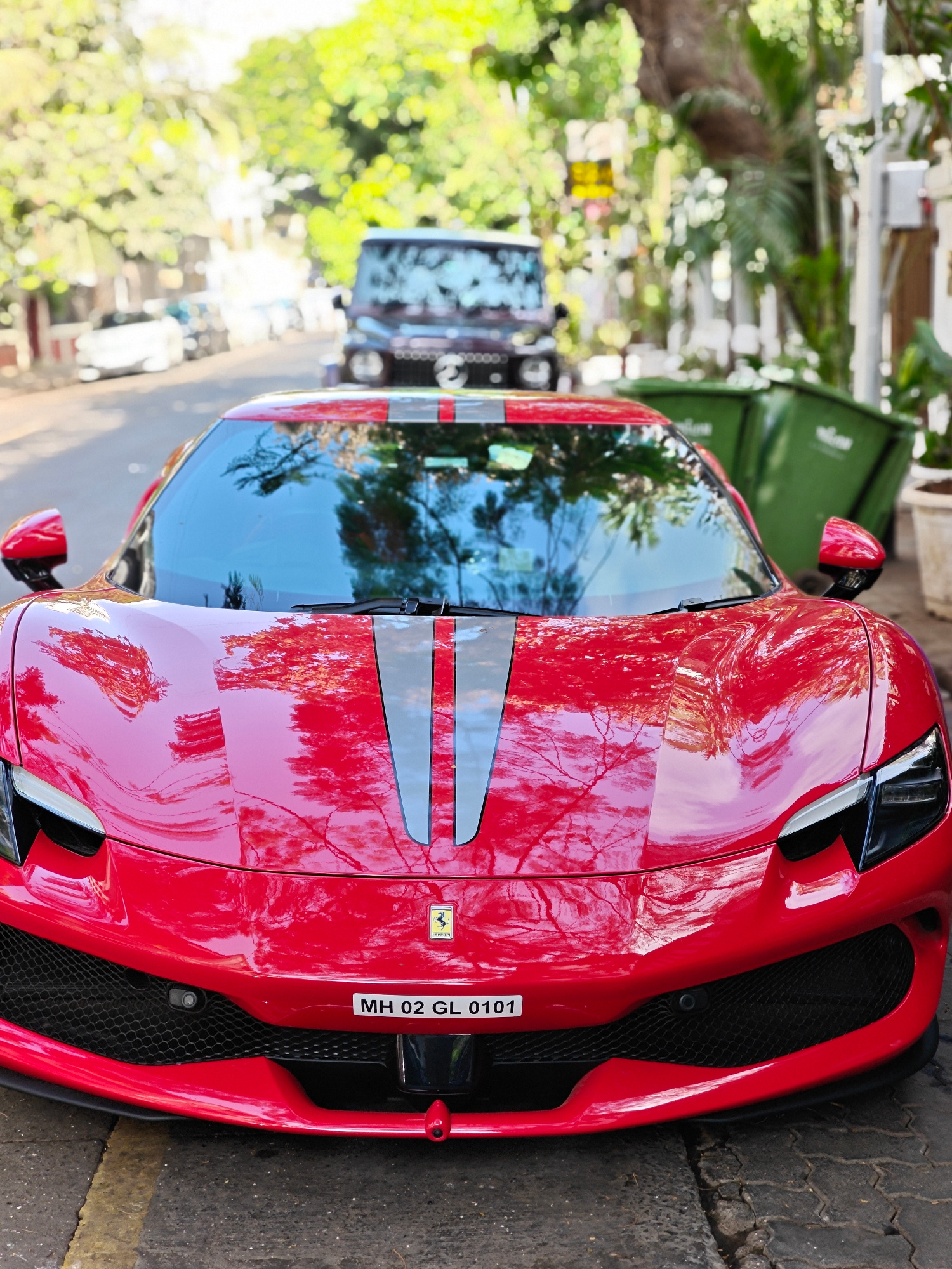 The image features a red Ferrari 296 GTB parked on a street, with a black Mercedes-Benz G-Wagon visible behind it. The license plate on the Ferrari reads "MH 02 GL 0101". The reflections on the car's…read more