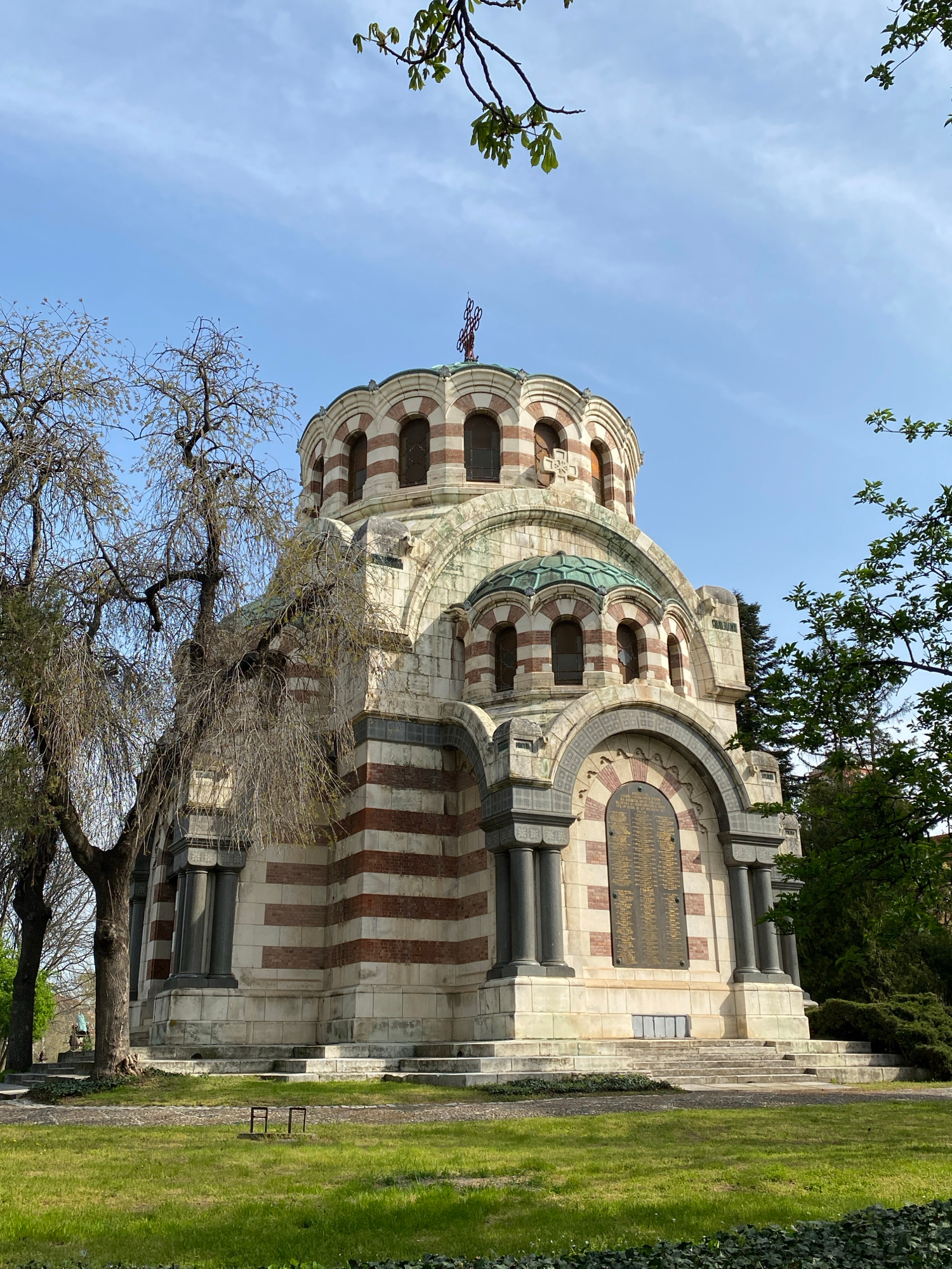The image shows the St. George the Victorious Chapel Mausoleum in Pleven, Bulgaria. It is a stone building with alternating horizontal bands of white and red. The structure features rounded arches, sm…read more