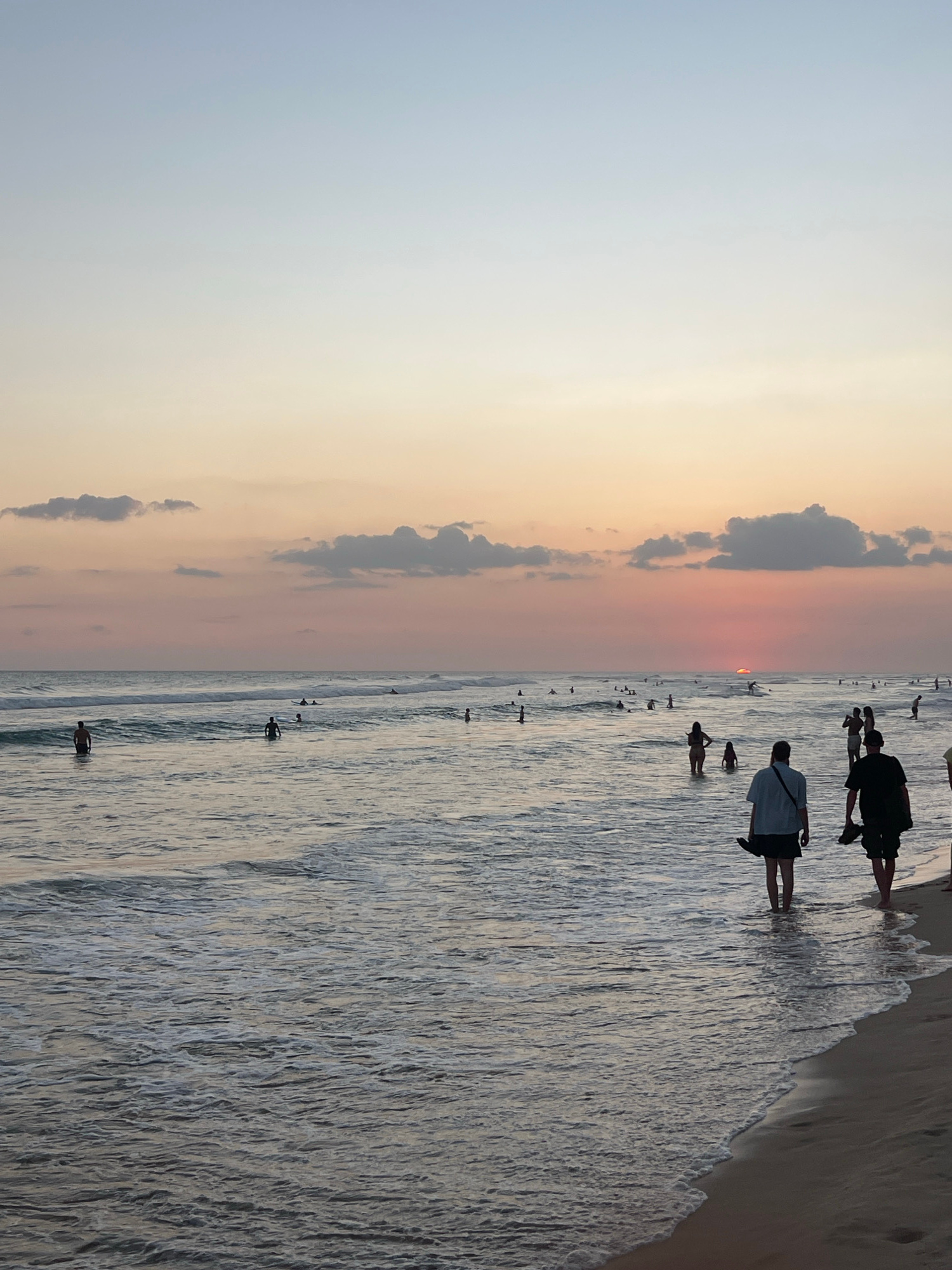 This image depicts a coastal scene at sunset in Kathaluwa, Sri Lanka. The sun, visible as an orange-red disc, is positioned just above the horizon over the ocean, casting a warm hue across the lower s…read more