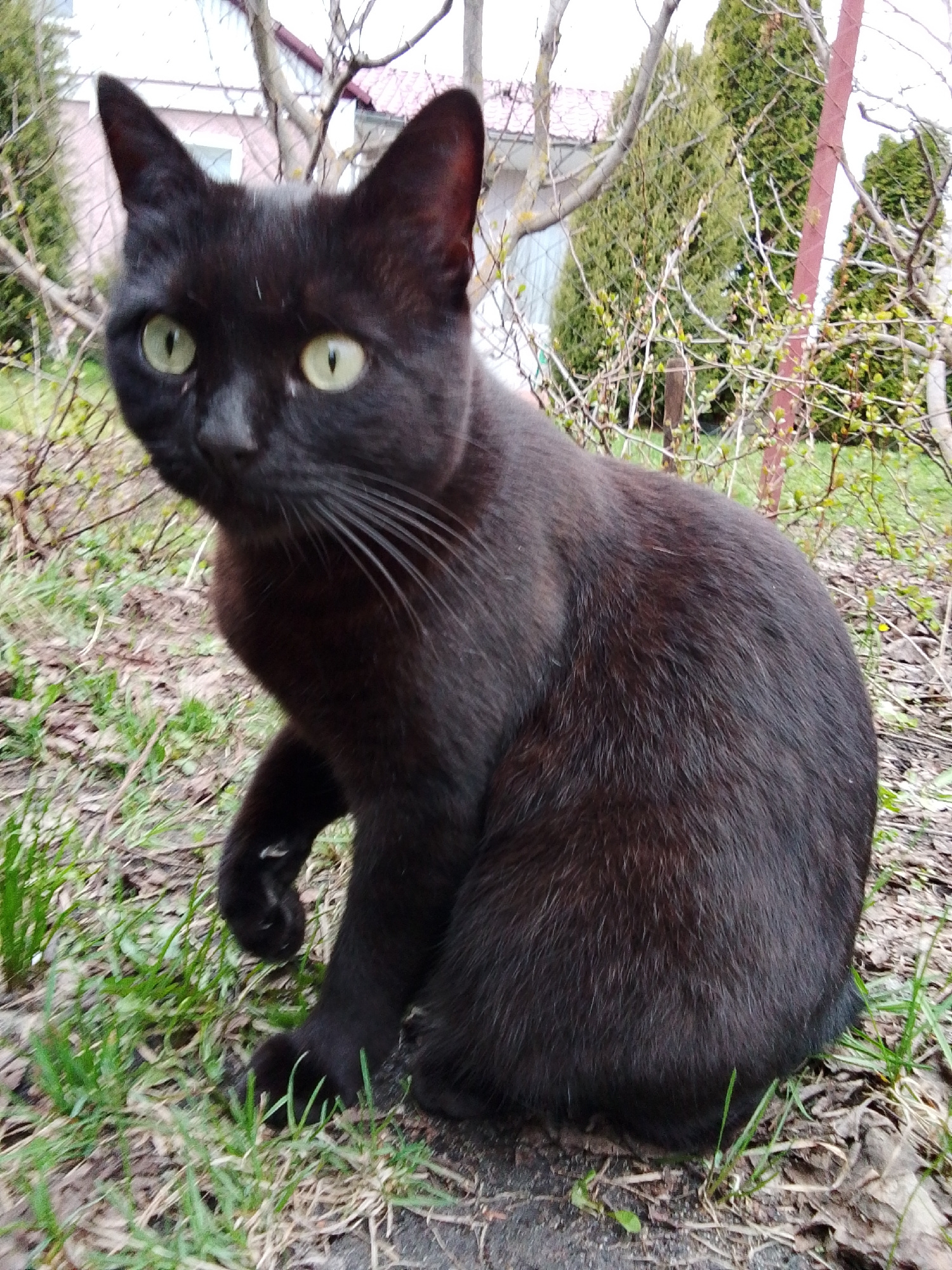 A black cat is sitting on the grass. The cat has yellow-green eyes and pointy ears. The background features trees and a building. The cat is located in Khlevnoye, Russia.