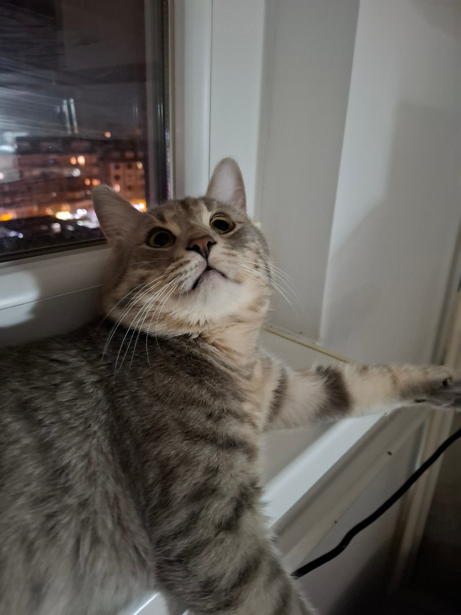 A silver tabby cat is captured in a playful or curious moment, hanging upside down by a window. The cat, with its prominent whiskers and wide, bright yellow-green eyes, looks directly at the camera wi…read more