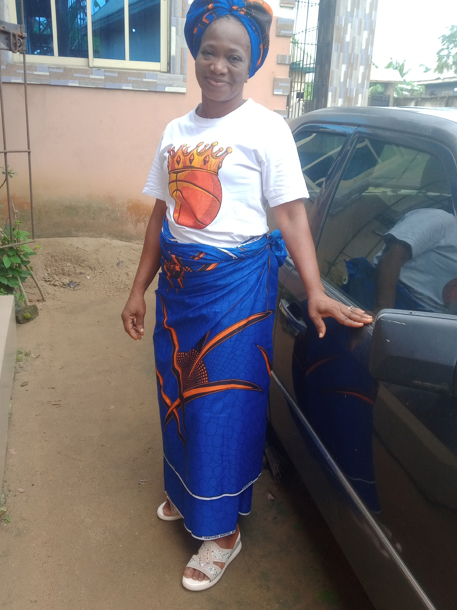 A middle-aged woman stands smiling gently at the camera, posing outdoors in Obehie, Nigeria. She is wearing a white short-sleeved t-shirt with a graphic featuring a basketball adorned with a golden cr…read more