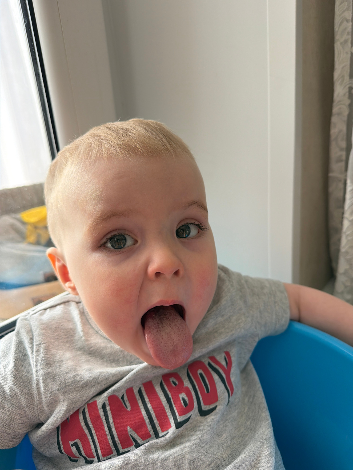 A toddler with light blond hair and blue eyes is shown in a close-up, upside-down view, sticking their tongue out. The toddler is wearing a grey shirt with a red and black design. The toddler is sitti…read more