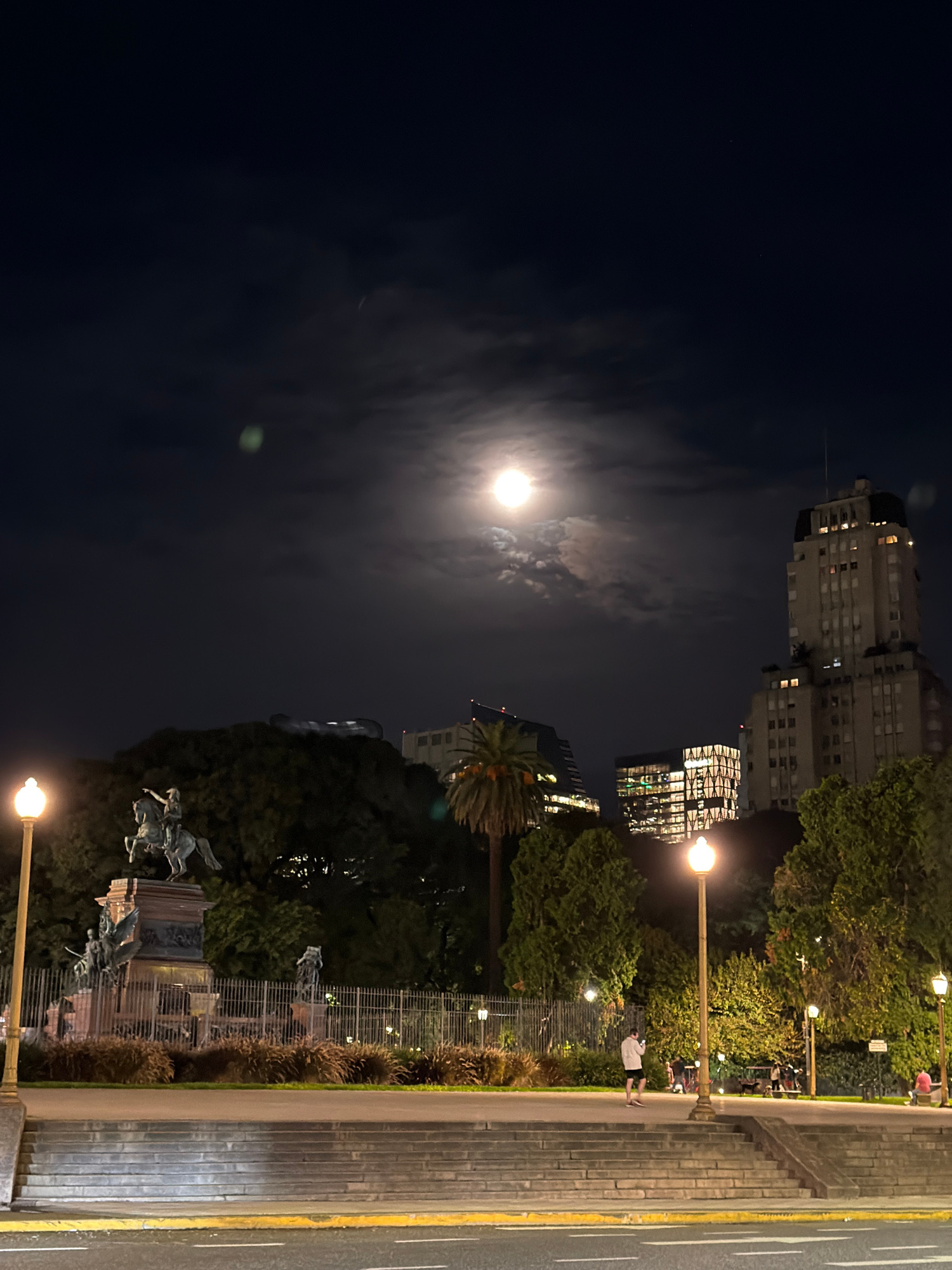The image shows a nighttime scene in Buenos Aires, Argentina. The full moon is visible in the dark sky, partially obscured by clouds. A row of buildings lines the right side of the frame, interspersed…read more