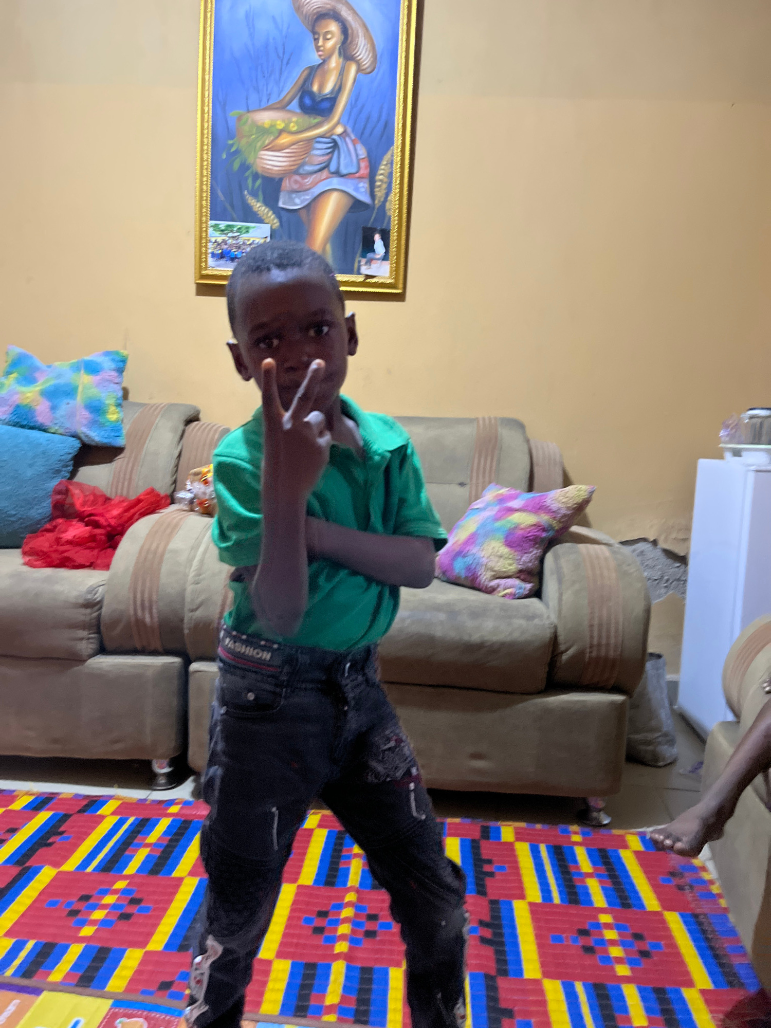 A young person is the primary subject in the scene, standing next to a brown sectional sofa. The individual is light-skinned, wearing a green shirt and black pants. They are making a V-sign with their…read more
