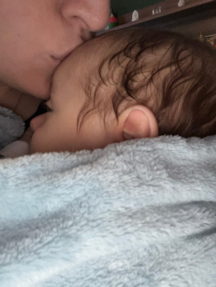 The scene depicts an intimate indoor interaction between two individuals within a residence in Wüstenrot, Germany. An adult, exhibiting light skin pigmentation, is shown kissing an infant on the foreh…read more