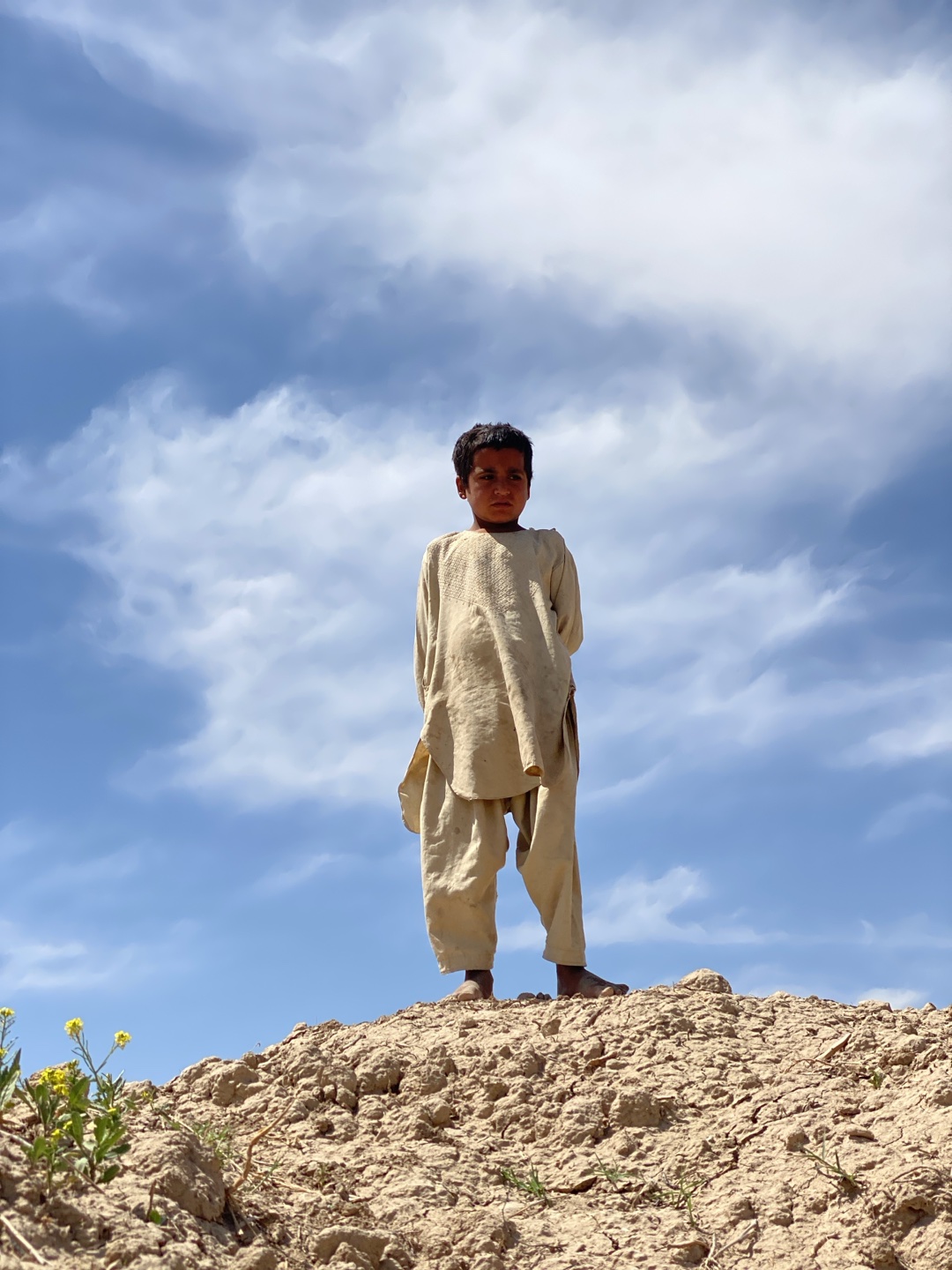 A young boy stands on a cracked, dry, dirt mound against a backdrop of a blue sky with cumulus clouds. He wears a light-colored, loose-fitting shalwar kameez. The location is Kandahar, Afghanistan. Ye…read more