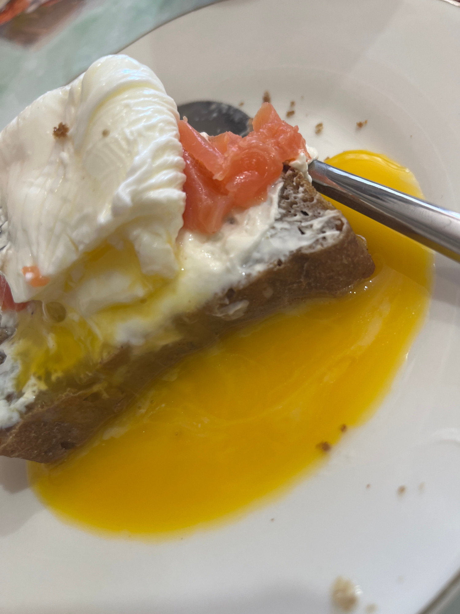 A close-up, overhead shot captures a serving of food on a white ceramic plate, likely depicting a breakfast or brunch item. The main subject is a piece of dark-colored bread or toast, topped with a ge…read more