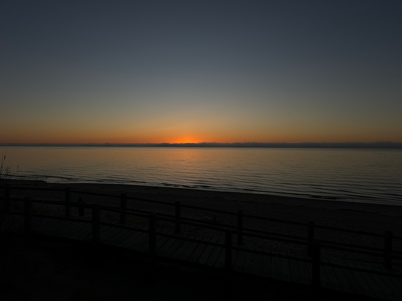 The image captures a twilight or dawn scene at the beach in Carnikava, Latvia. The sky transitions from a dark blue-grey to a golden orange at the horizon. A narrow strip of the setting or rising sun…read more