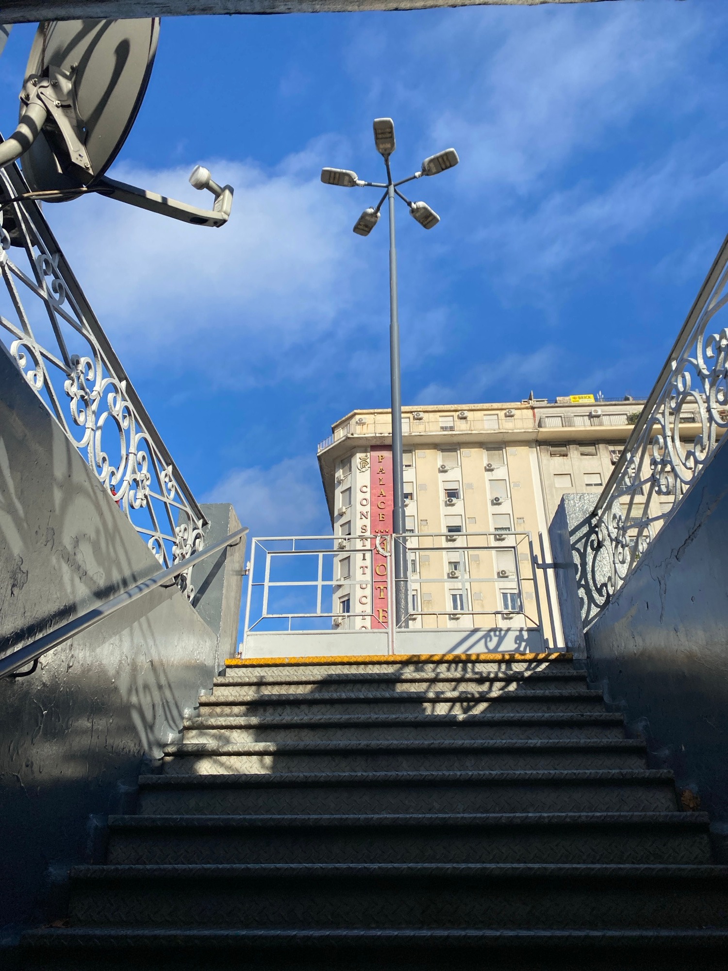 The image presents a dramatic, low-angle perspective looking sharply upwards towards a clear blue sky in an urban setting, likely Buenos Aires, Argentina. On the right side of the frame, a dark, meta…read more