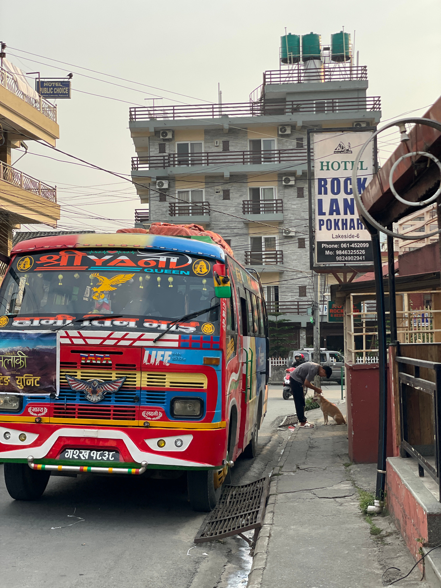 The image shows a brightly colored bus parked on a street in Pokhara, Nepal. The bus is adorned with various decorations, including images of eagles, flags, and Nepali script. Behind the bus, there i…read more