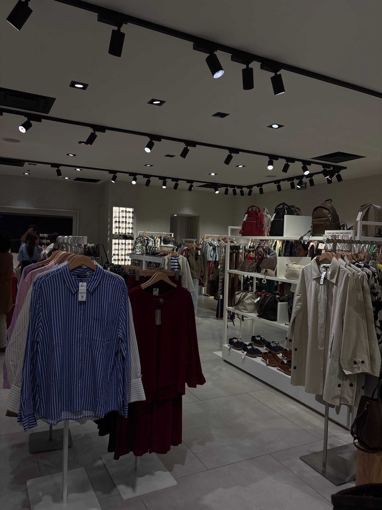 The image shows the interior of a clothing store. On the left, there is a white wall adorned with a series of black track lights. Clothing racks are filled with various garments, including shirts and…read more