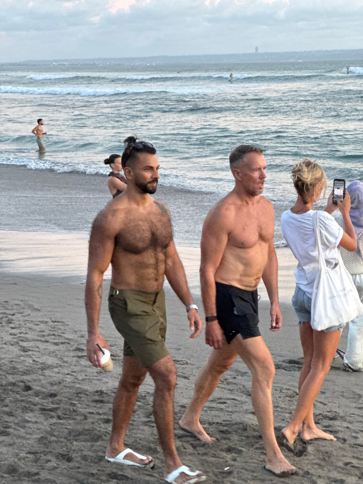 The image shows three adults on a beach in North Kuta, Indonesia. Two men, one wearing black shorts and the other wearing khaki shorts, are walking in the foreground. The man in khaki shorts is holdinβ¦read more