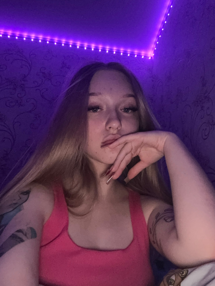 The image displays a young female subject positioned centrally in an indoor environment. She has long, straight blonde hair and is wearing a pink tank top. Her gaze is directed towards the camera. Her…read more