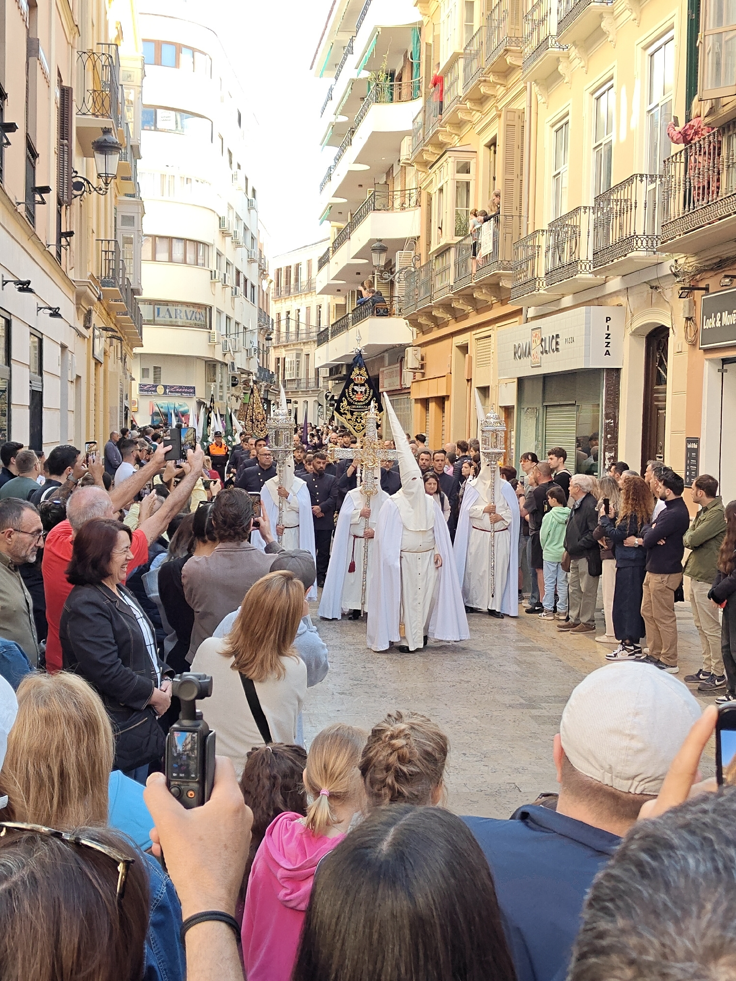 The image depicts a street scene in Málaga, Spain, during what appears to be a religious procession. The location is an urban street lined with multi-story buildings, featuring shops and apartments wi…read more
