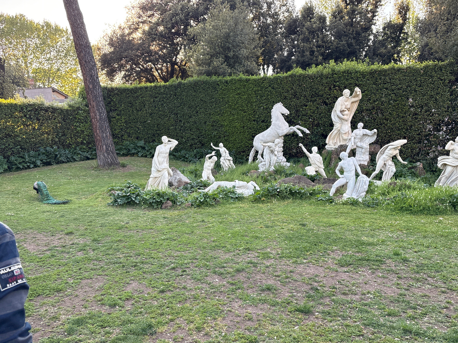 The image shows a garden scene in Rome, Italy. In the center of the frame are several white marble sculptures depicting human figures and a rearing horse. The sculptures are arranged on a grassy area…read more