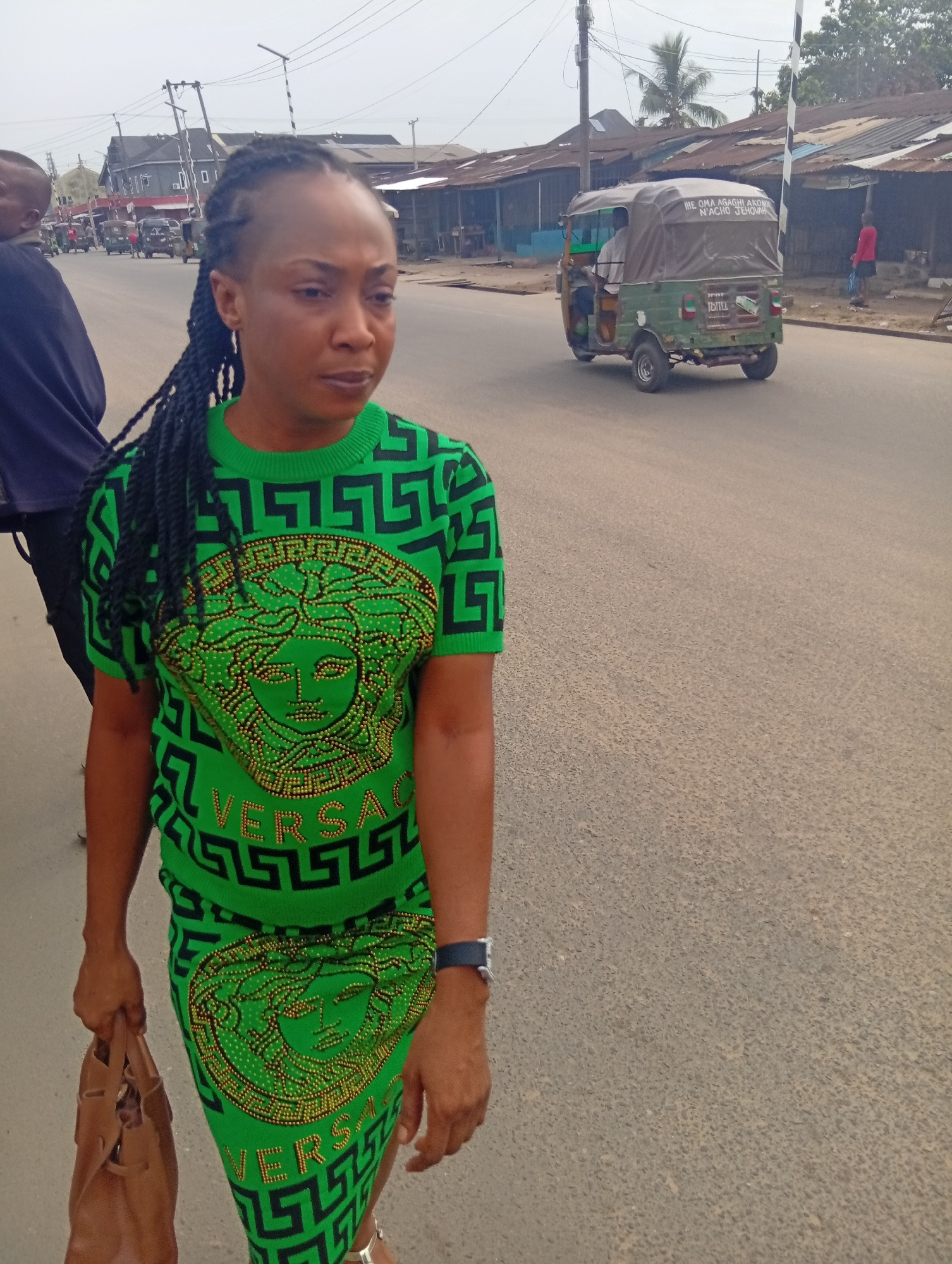 A woman in a green Versace print sweater and skirt is walking down a street in Umuode, Nigeria. She has black braided hair and is carrying a brown purse. A man is partially visible to her left wearingβ¦read more
