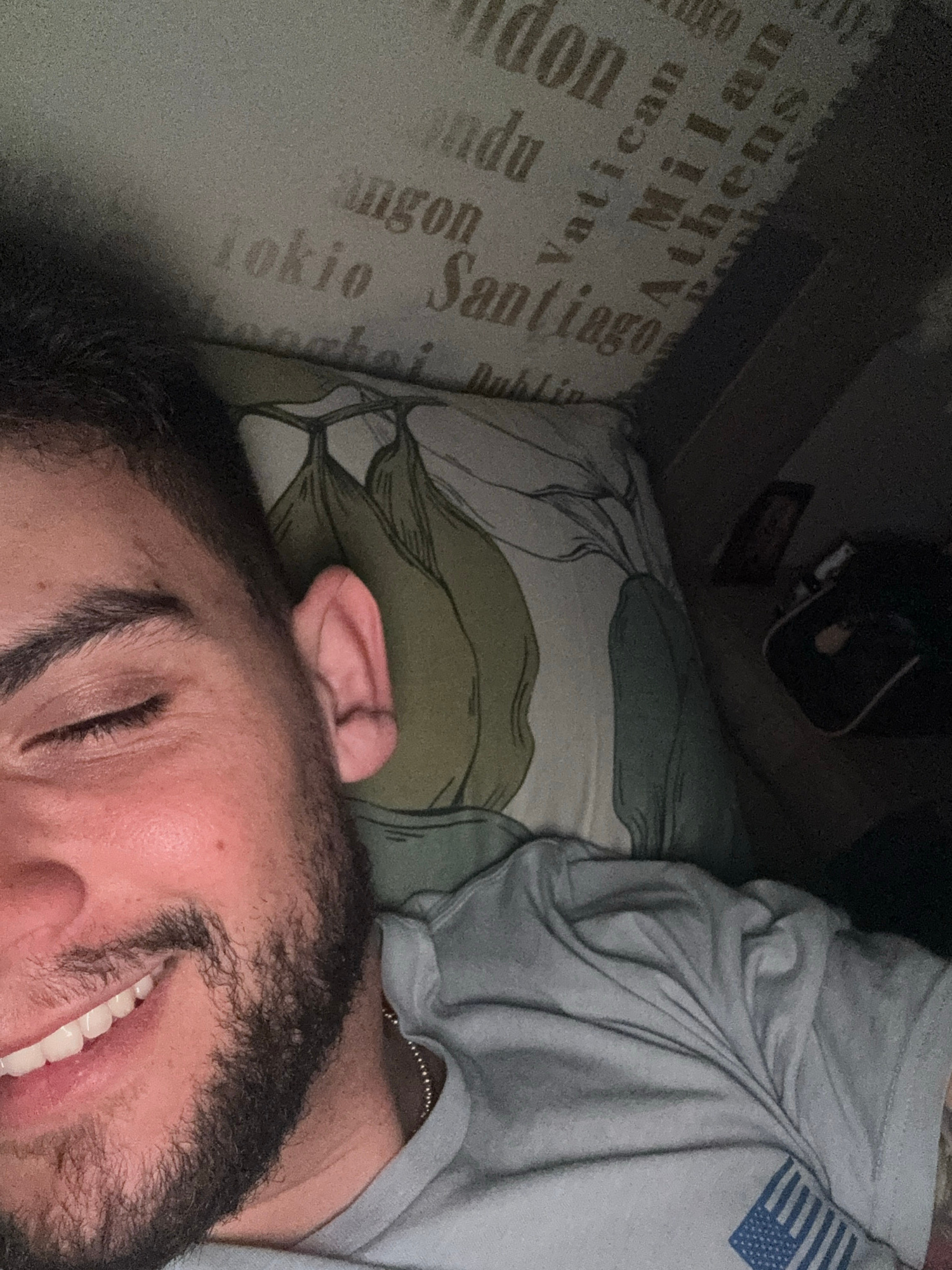 A close-up, rotated image shows a man lying down. He is facing away from the camera and has his eyes closed. He is smiling, and his teeth are visible. He has dark hair and a beard. He is wearing a gre…read more