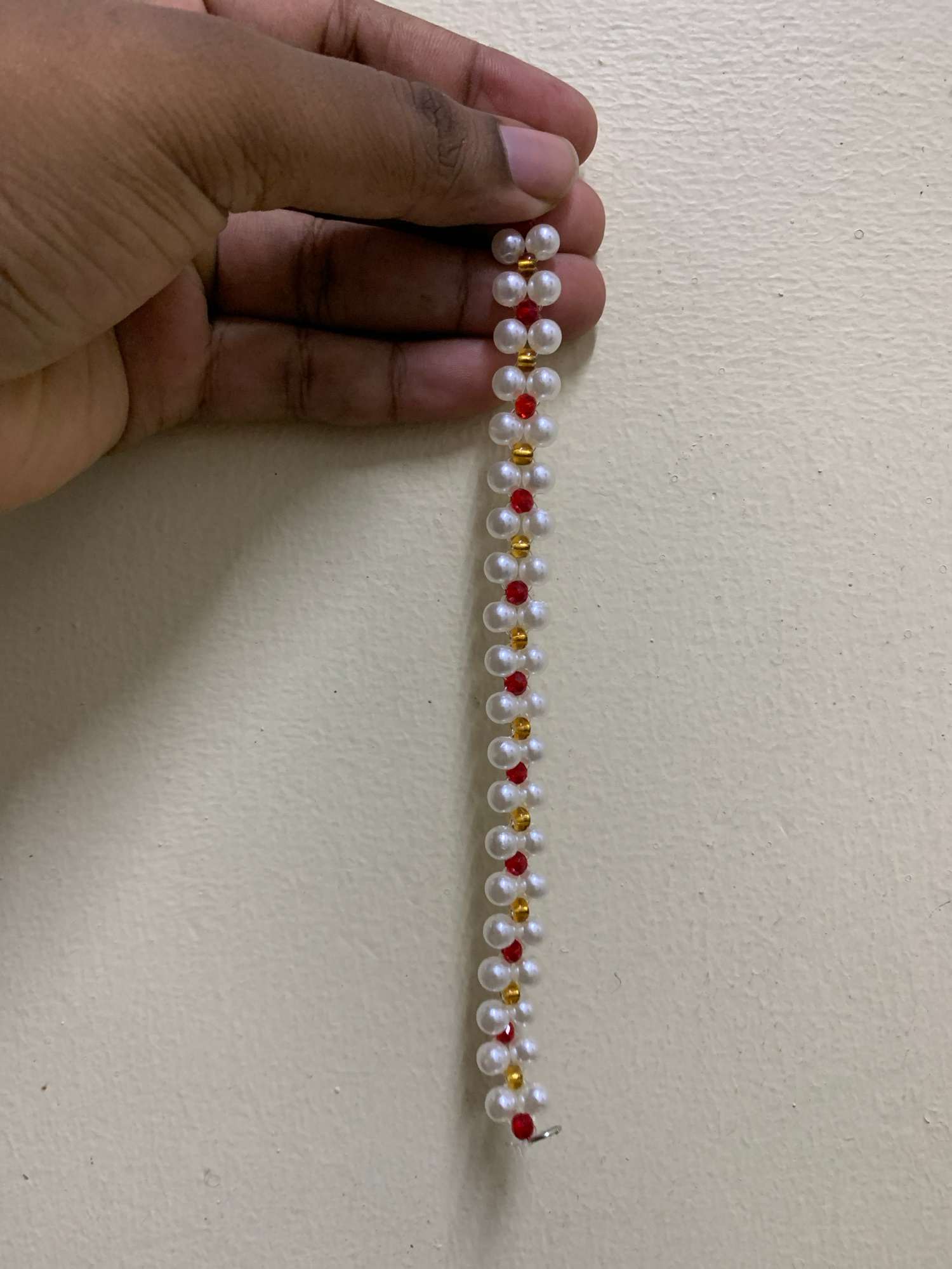 A hand holds a string of pearls with gold and red beads, against a cream-colored wall.