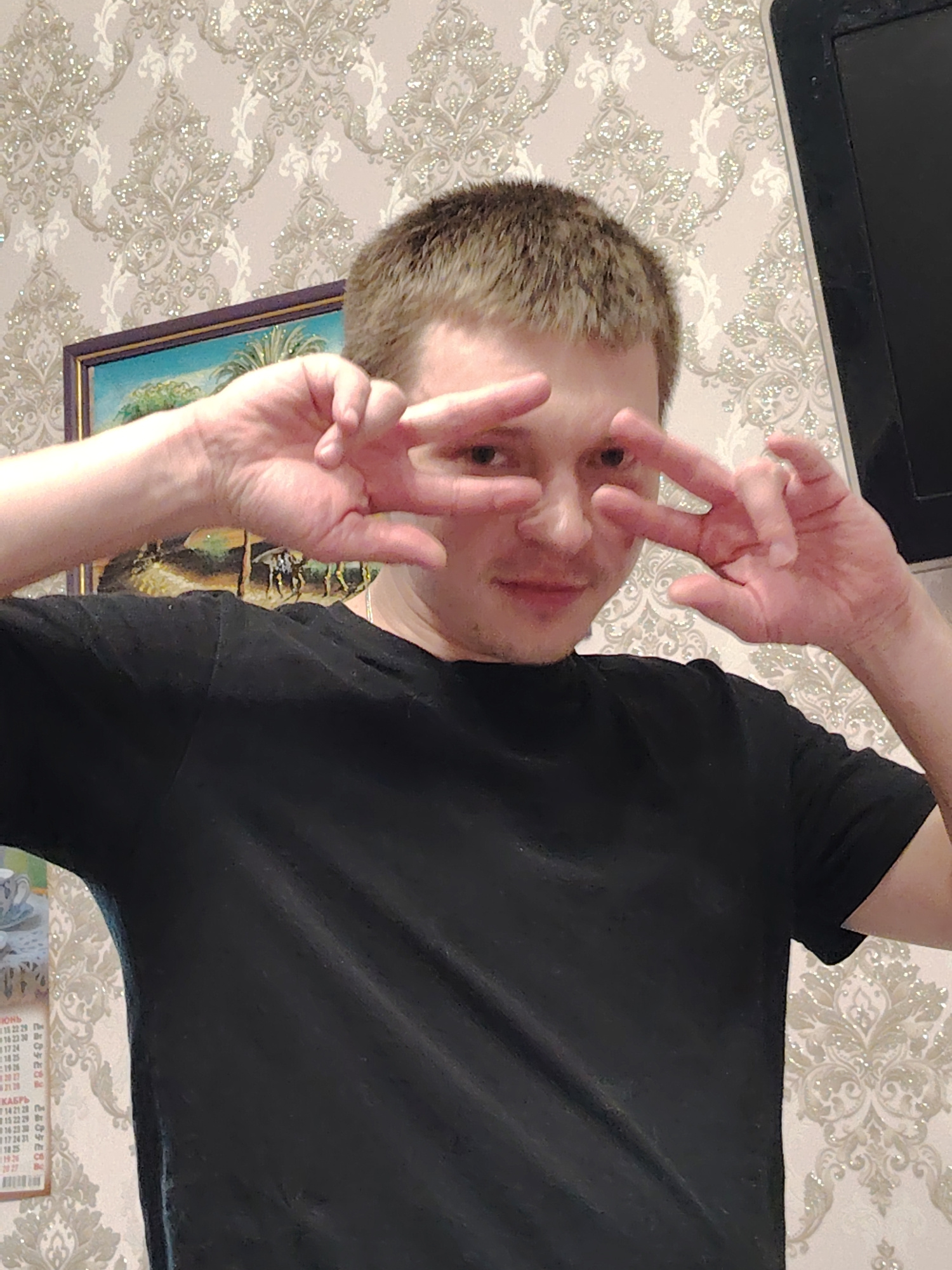 A fair-skinned person, likely male, poses for a selfie indoors, facing the camera directly. They are wearing a black t-shirt and making a "peace" or "victory" sign with both hands, positioning the sig…read more