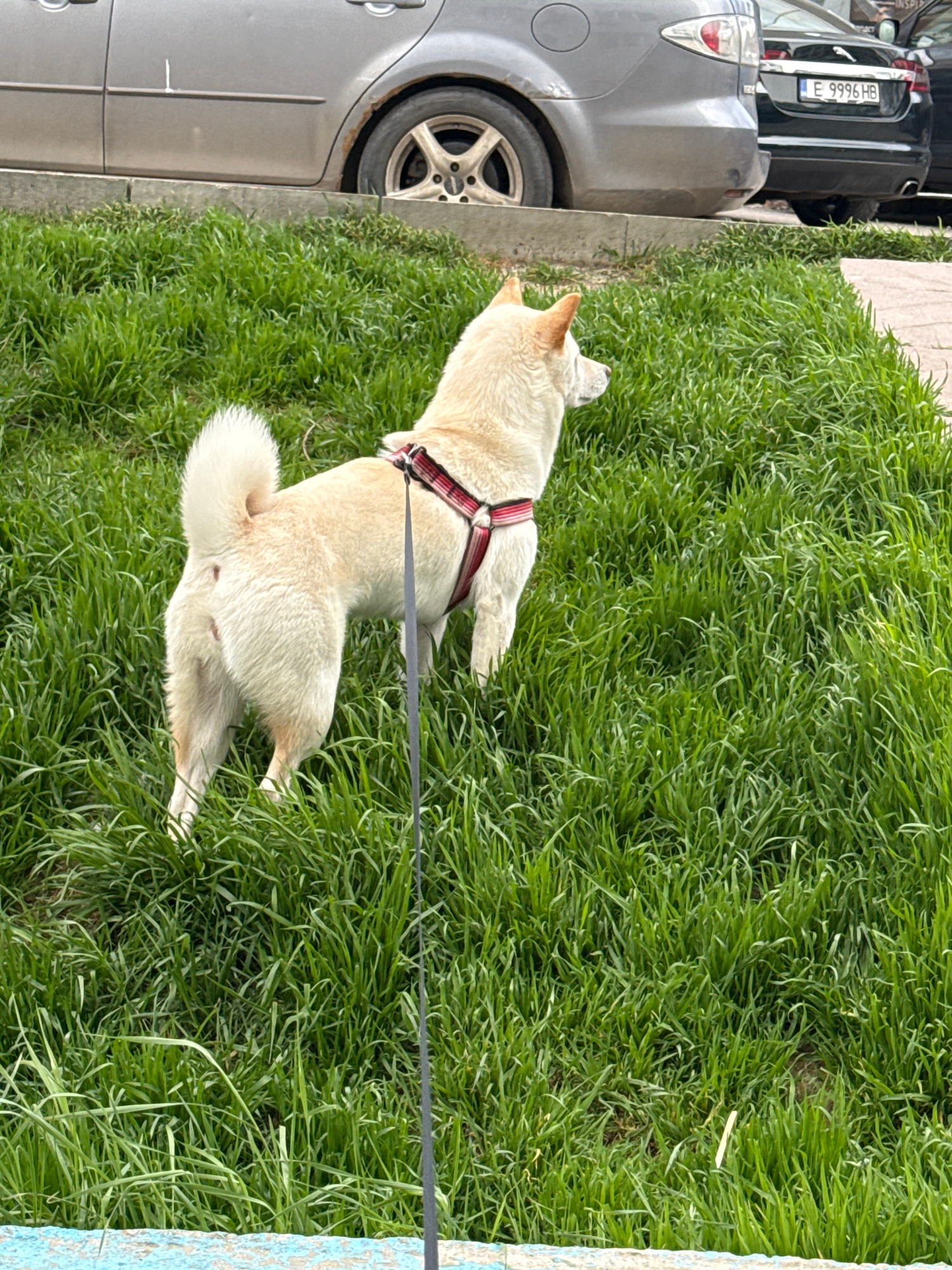 A light-colored dog with a red harness lies on green grass next to a gray car. The car is parked next to a sidewalk. A black car is parked behind the gray car. The license plate of the black car reads…read more