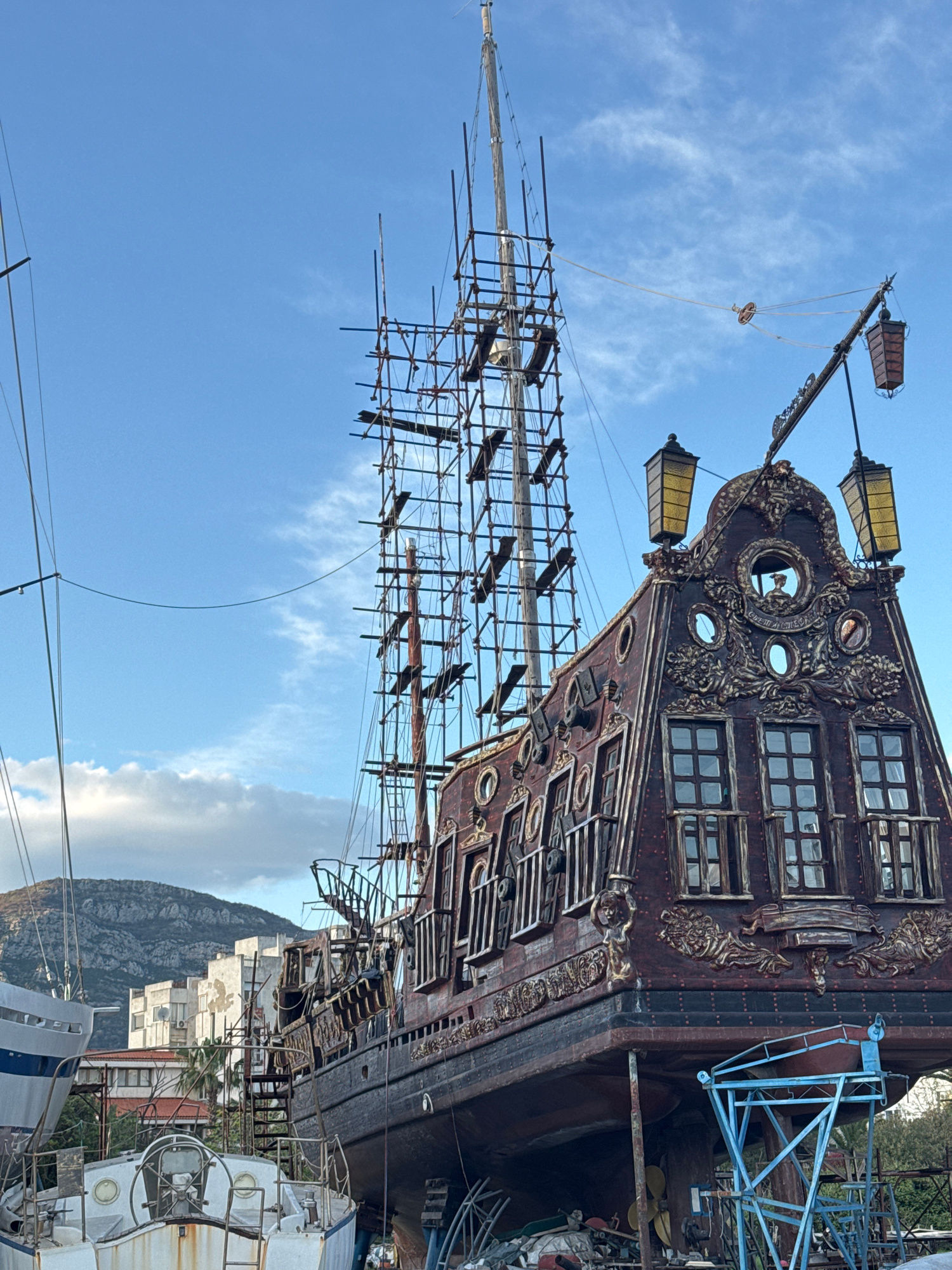 The image shows the stern and rigging of a large, ornate, brown, partially-constructed ship. The ship is docked in the city of Bar, Montenegro, close to land and other boats. The stern has multiple le…read more