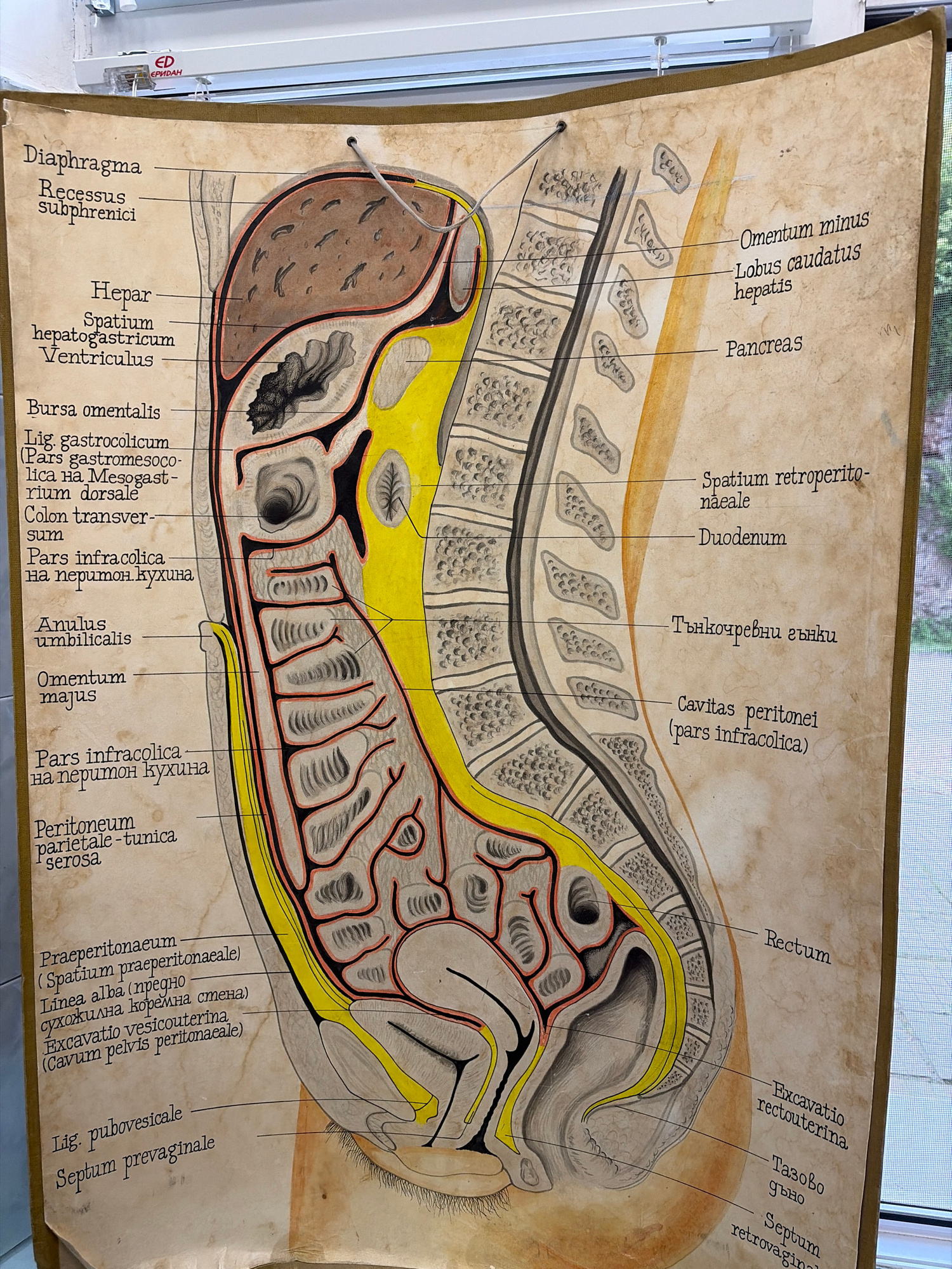 Here is a description of the image: This is an image of an anatomical diagram. The diagram depicts a cross-section of the human abdomen and pelvis, showing the arrangement of organs and peritoneal st…read more
