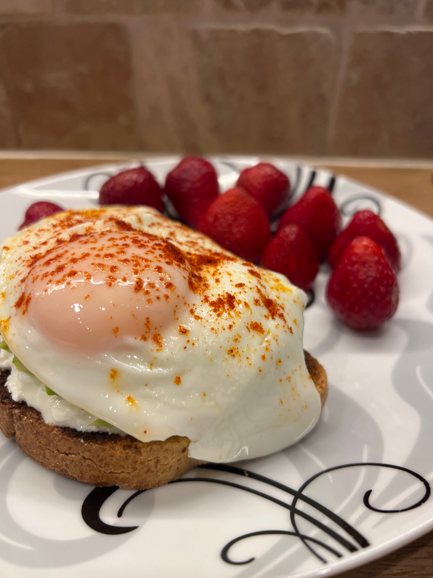 The image shows a plate of food. There is a line of strawberries to the left of a sandwich topped with a fried egg seasoned with paprika. The plate is white with black decorative patterns. The backgro…read more