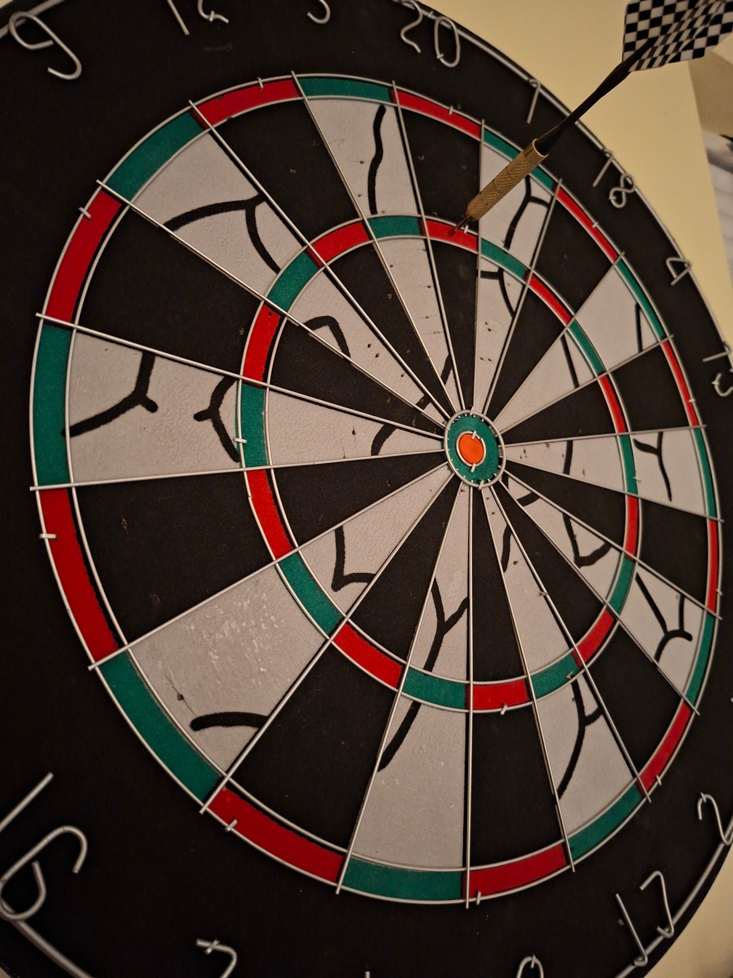The image shows a dartboard with a dart stuck in the triple 20 section. The dart has a checkered flight and a metallic barrel. The dartboard is a standard design with alternating black and white secti…read more