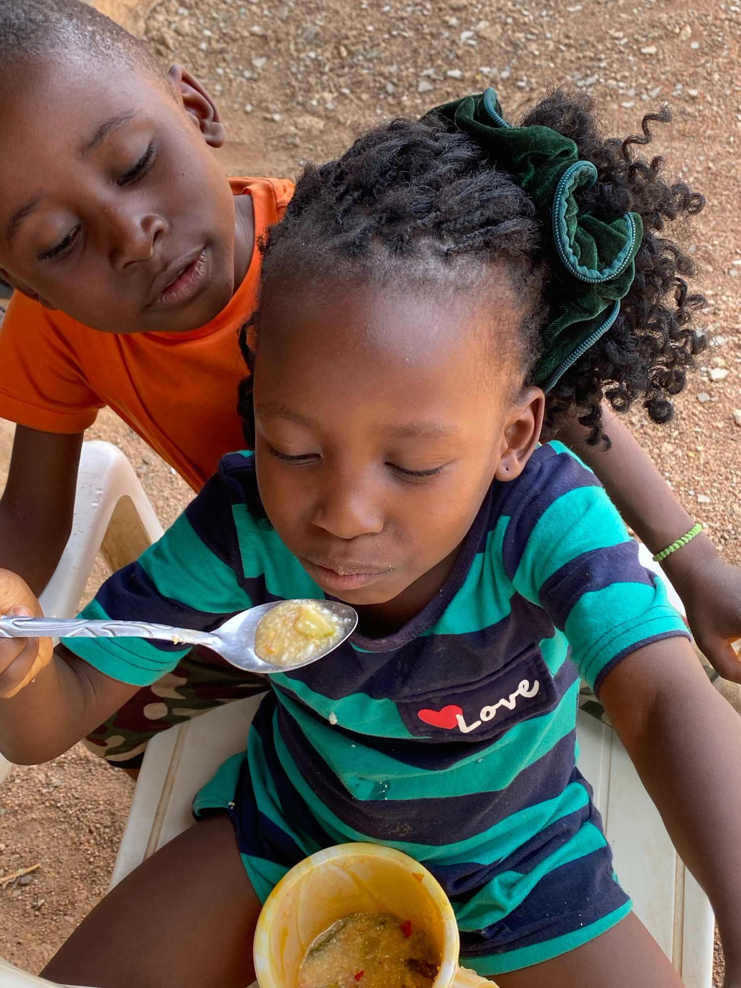 Two children are captured from an overhead angle, appearing to be in a location that resembles Kuru Karama, Nigeria. One child wears a striped teal and navy shirt with the word "love" and a heart on t…read more