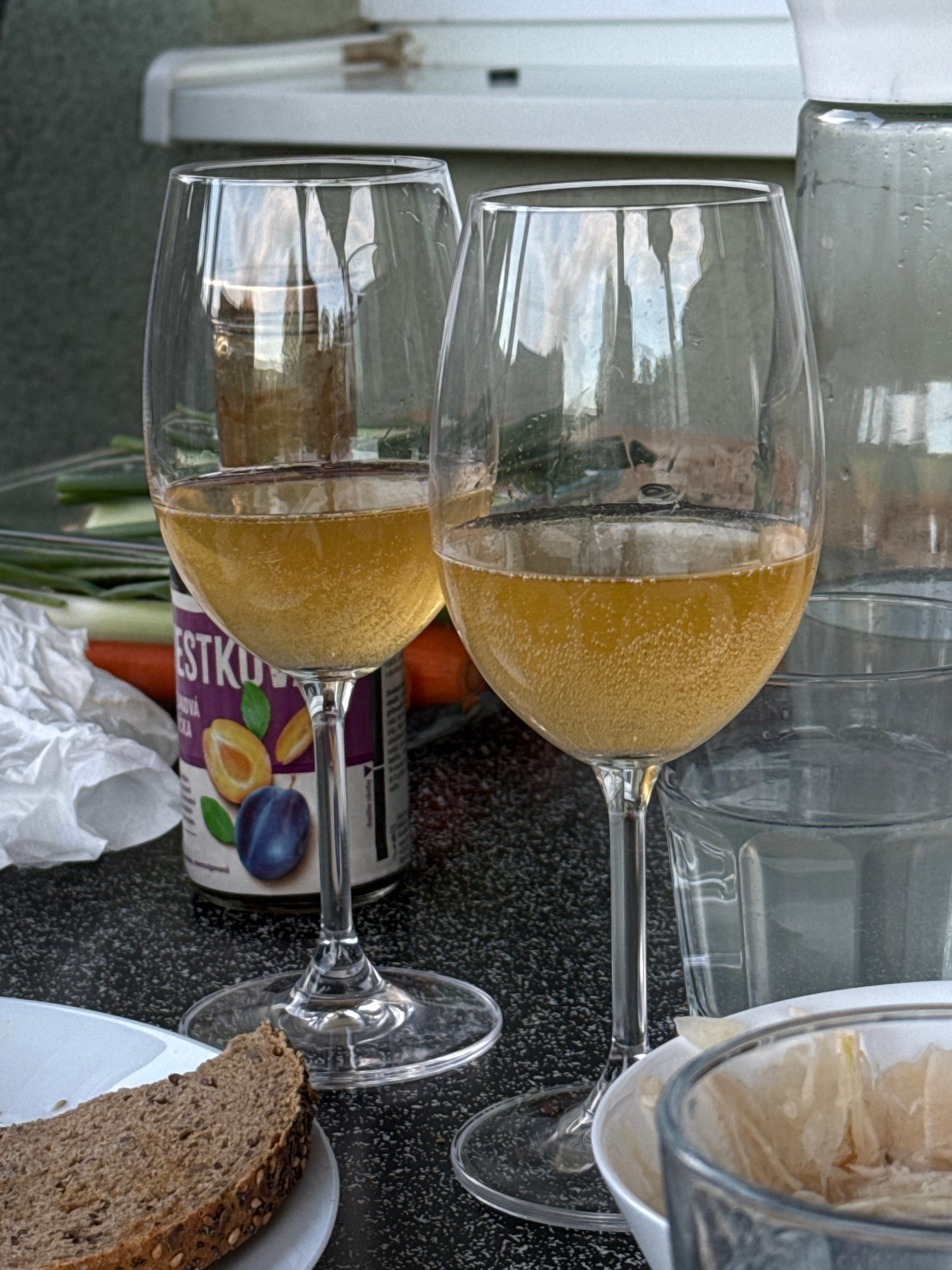 The image depicts a countertop scene in what appears to be Biely Kostol, Slovakia, based on the presence of a "ESTKO" brand product, which suggests a local origin. There are two wine glasses, each parβ¦read more