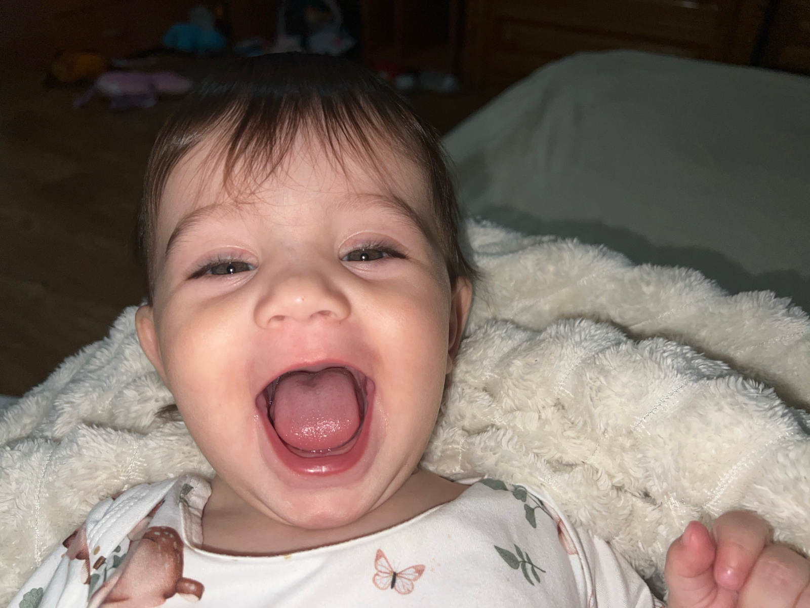 A close-up indoor photograph captures an infant, positioned to appear to be lying down, smiling broadly with an open mouth revealing the tongue and upper palate. Moisture is visible on the lower lip a…read more