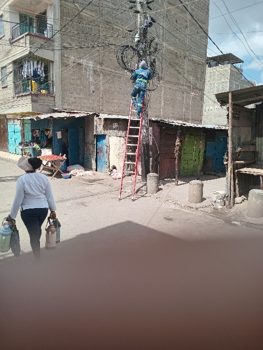 The image depicts an urban street scene in Nairobi, Kenya. A person dressed in a blue jumpsuit with a visible logo on the back stands on a red metal step ladder, actively engaged with a dense clusterβ¦read more