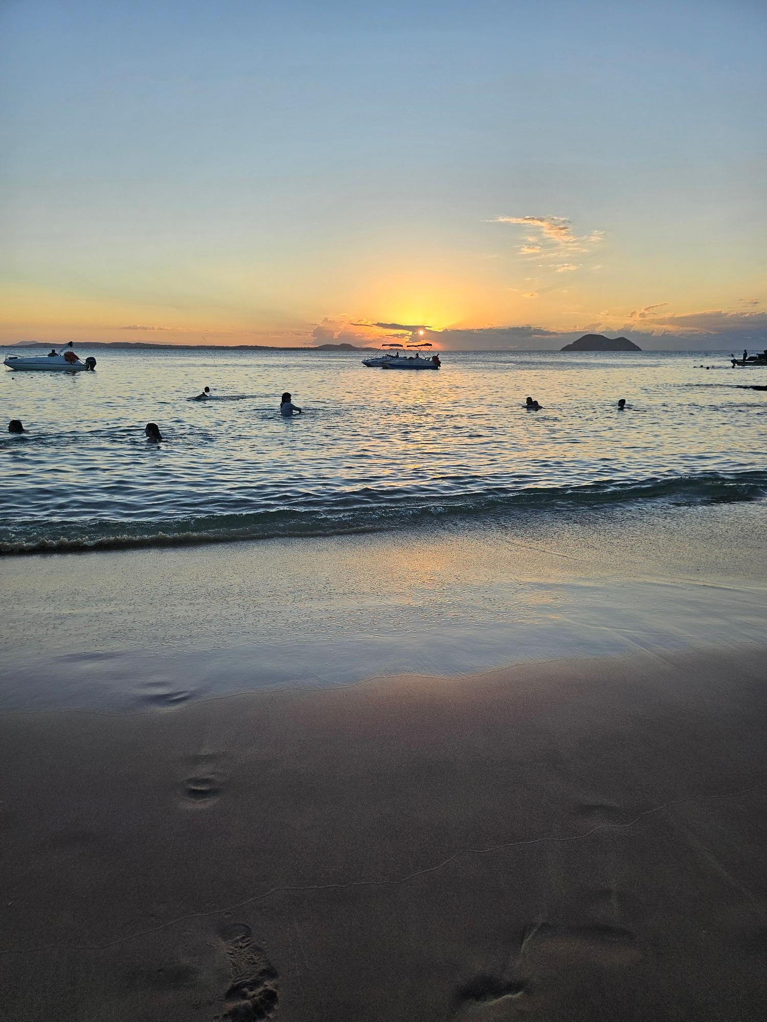Here's a forensic description of the image: **Scene:** A beach at sunset in Armação Dos Búzios, Brazil. **Environment:** The sky transitions from a light blue to orange-yellow at the horizon. The su…read more