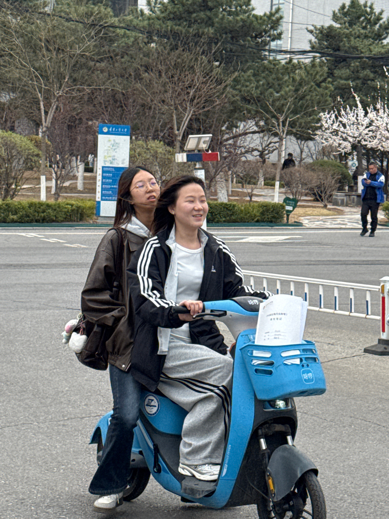 Two young women are riding a blue scooter on a paved road in Zhongtun, China. One woman is wearing a brown jacket, jeans, and glasses. The other woman is wearing a black jacket with white stripes, a w…read more