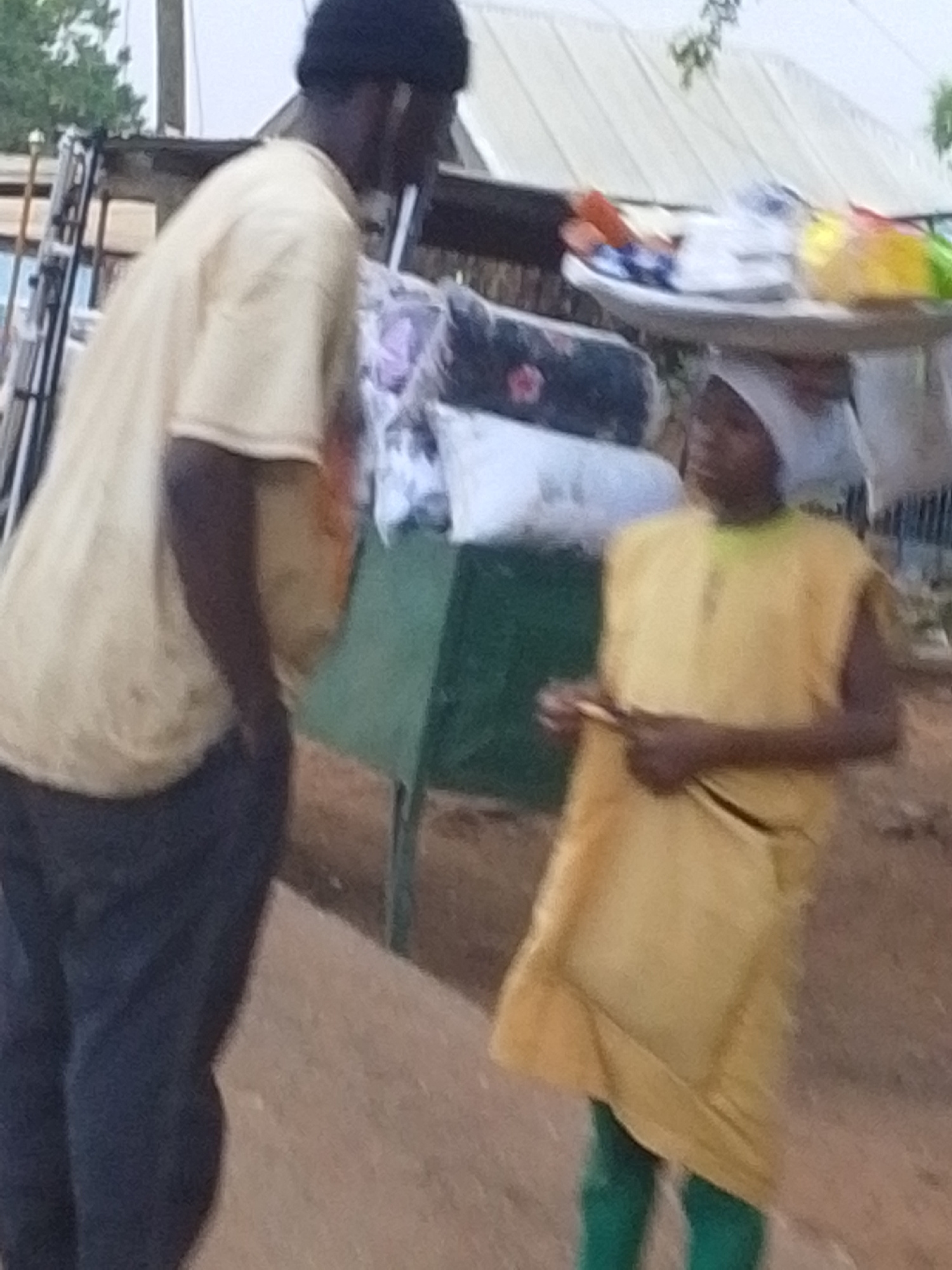 The image shows two individuals engaged in an interaction on what appears to be a street in an urban environment, possibly the city of Tamale, Ghana, although that is not definitively confirmed in the…read more