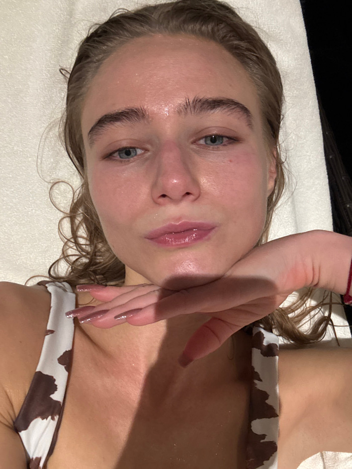 A fair-skinned woman with blonde curly hair lies on a white towel. Her face appears shiny, perhaps with moisture or oil. She has light blue eyes, and her hand is positioned near her face. She wears a…read more