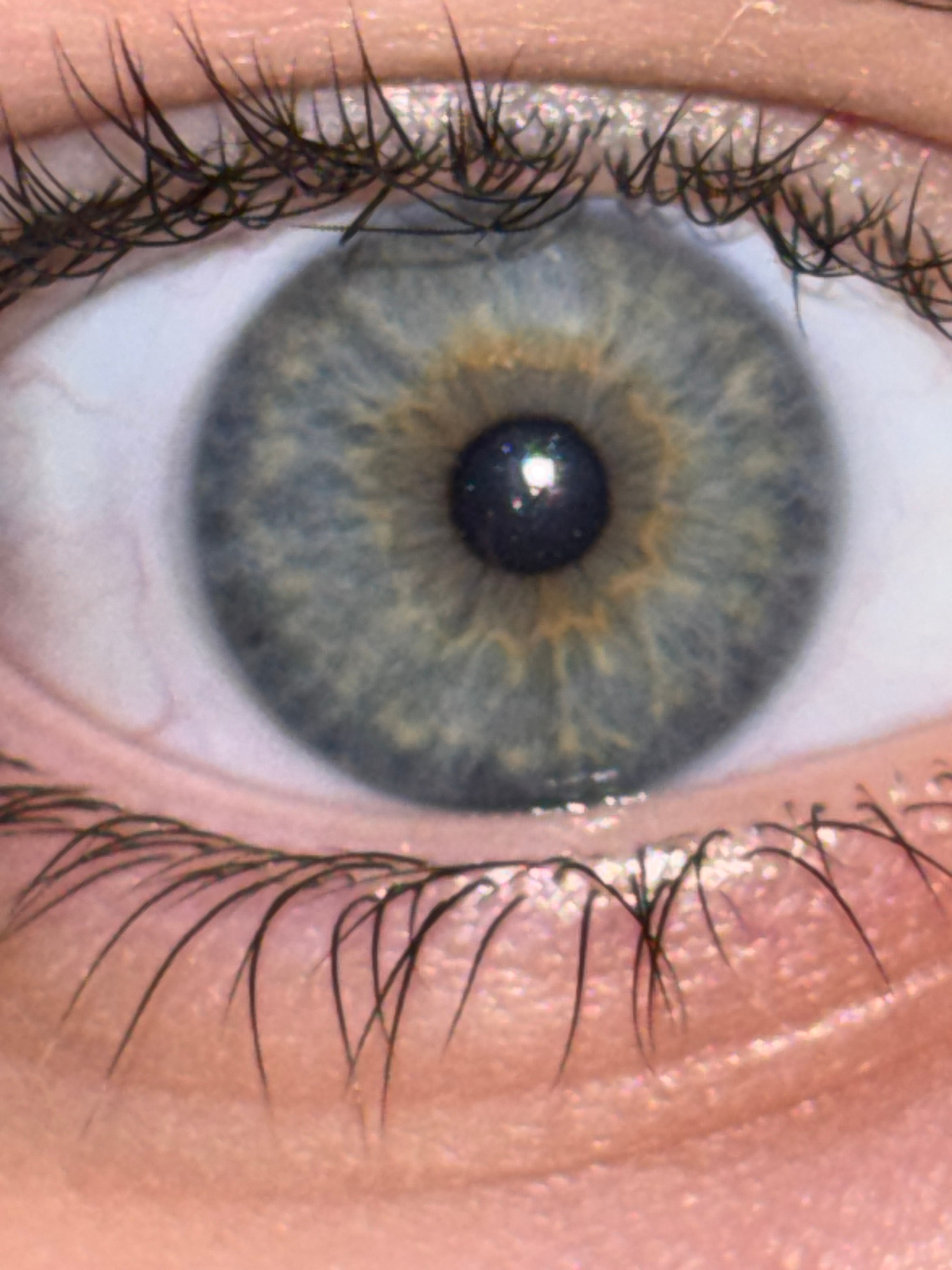 A close-up photograph shows a human eye, specifically focusing on the iris and eyelashes. The iris displays a mix of blue and grey hues, with a ring of brownish-gold pigmentation surrounding the pupil…read more